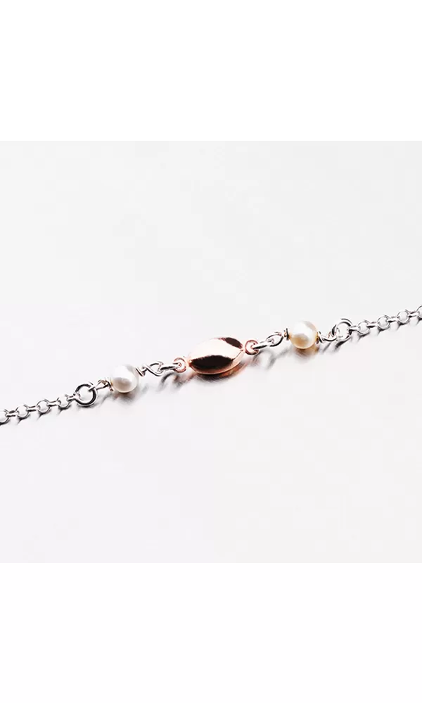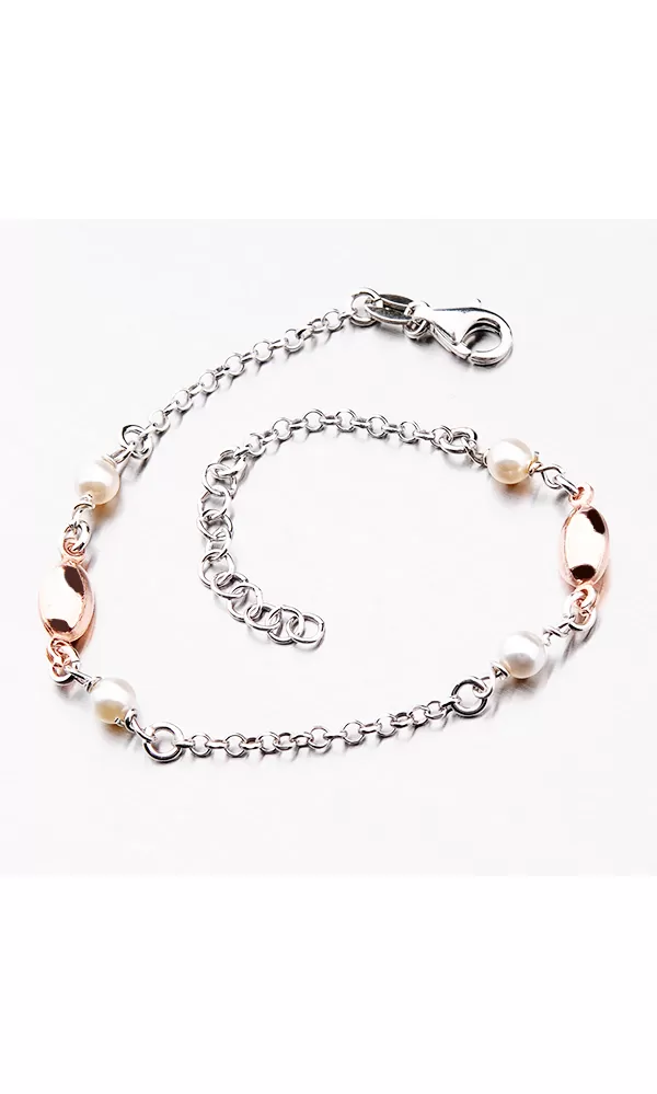 Dámsky náramok je zdobený pozlátenými oválkami a umelými perlami. Dĺžka náramku je 17 cm, s využitím retiazky 3 cm, je možné náramok zapnúť v dĺžke 17 až 20 cm. Náramok je vyrobený zo striebra s rýdzosťou 925/1000 v lesklej povrchovej úprave a povrch náramku je zušľachtenýrhodiovaním.  Náramok sa zapína na karabínu.