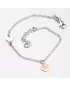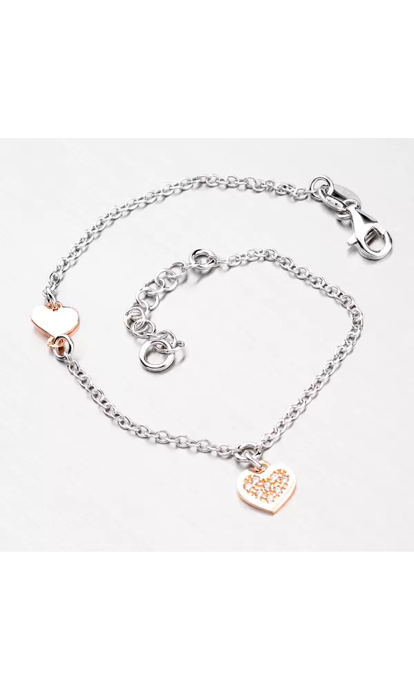 Týmto krásnym náramkom môžete obdarovať seba alebo niekoho na kom vám záleží. Náramok pôsobí veľmi jemne. Základom je retiazka, ktorá je zdobená srdiečkami. Srdiečka sú opatrené PVD povrchovou úpravou, ktorá im dodáva farbu ružového zlata. Jedno zo sŕdc je zdobené zirkónmi.