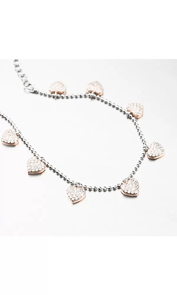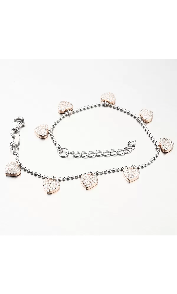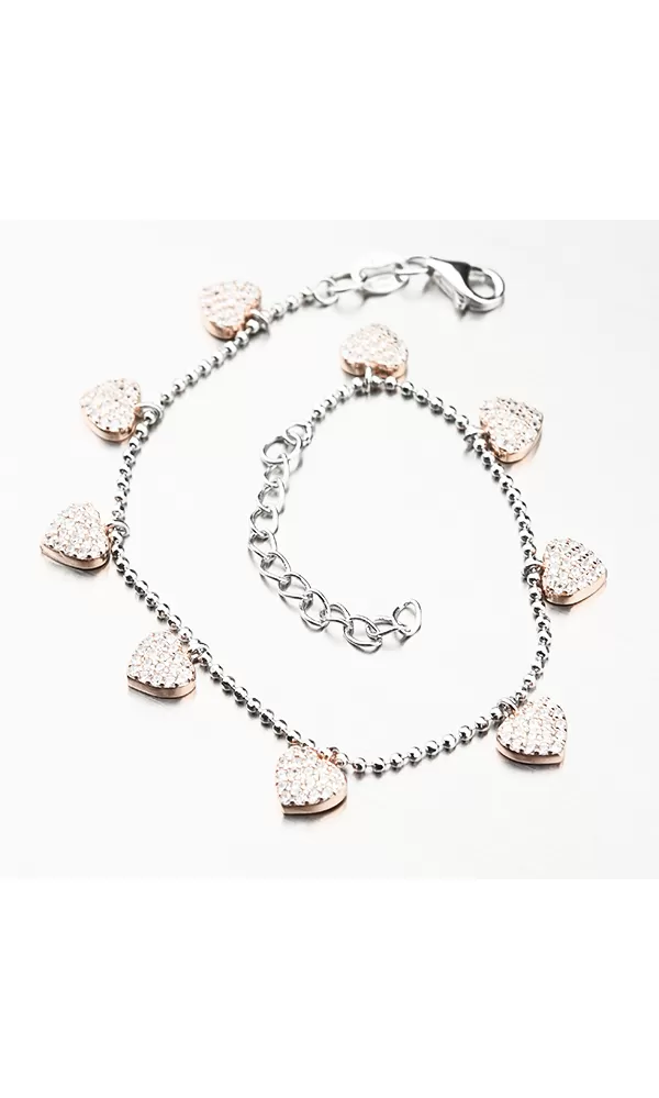 Nežný náramok je vyrobený zo striebra o rýdzosti 925/1000 v lesklej povrchovej úprave. Náramok je zdobený srdiečkami, ktoré sú pozlátené technikou PVD vo farbe ružového zlata. Prednosťou zlatenia technológií PVD je vysoká tvrdosť a odolnosť proti oteru! Ide o hrubú vrstvu, ktorá preniká do pôvodného materiálu. Zlatenie technológií PVD sa dá porovnať s približne 12 mikrónmi galvanického zlatenia, čo je vysoká hodnota, ktorá pri bežnom nosení vydrží až 12 rokov.