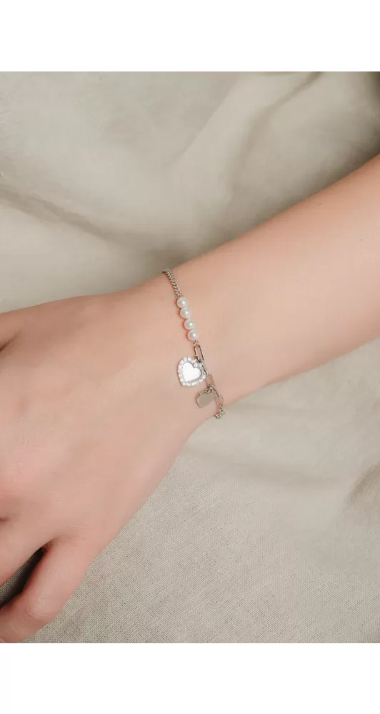 Náramok, ktorý očarí hneď na prvý pohľad svojim originálnym prevedením. Náramok je z dvoch typov retiazok a vo svojom strede ho zdobia dve ozdoby v tvare srdca, z toho jedno lesklé a druhé osadené žiarivými zirkónmi a potom ho zdobia štyri biele syntetické perly. Zirkóny sú okrúhleho briliantového brusu, ktorý zaisťuje maximálnu brilanciu vybrúsených facet, dokonale odráža svetlo a neuveriteľne žiari z každého uhla pohľadu.