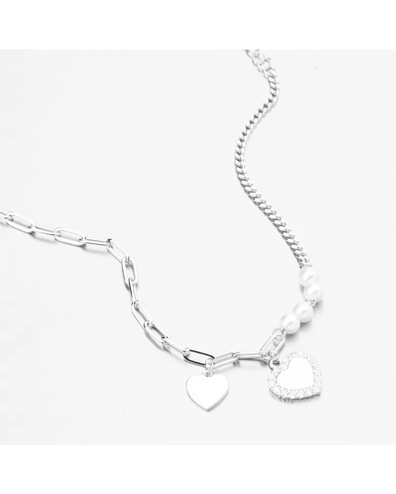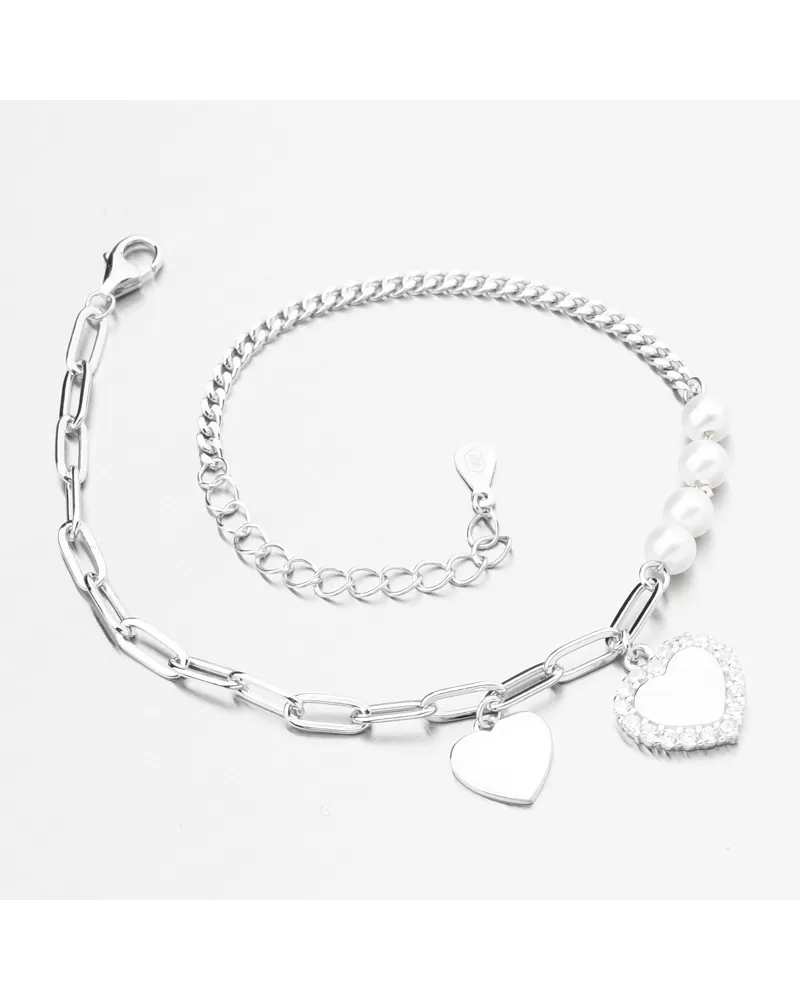 náramok, ktorý bude očariť na prvý pohľad svojím pôvodným dizajnom. Náramok je vyrobený z dvoch typov reťazcov av jeho strede je zdobený dvoma ozdobami v tvare srdca, z ktorých jeden je lesklý a druhý vybavený žiarivými zirkónmi a potom zdobený štyrmi bielymi syntetickými perlami. Zirkóny sú okrúhly brilantný strih, ktorý poskytuje maximálnu brilanciu leštenej fazety, dokonale odráža svetlo a neuveriteľne svieti zo všetkých pohľadov.