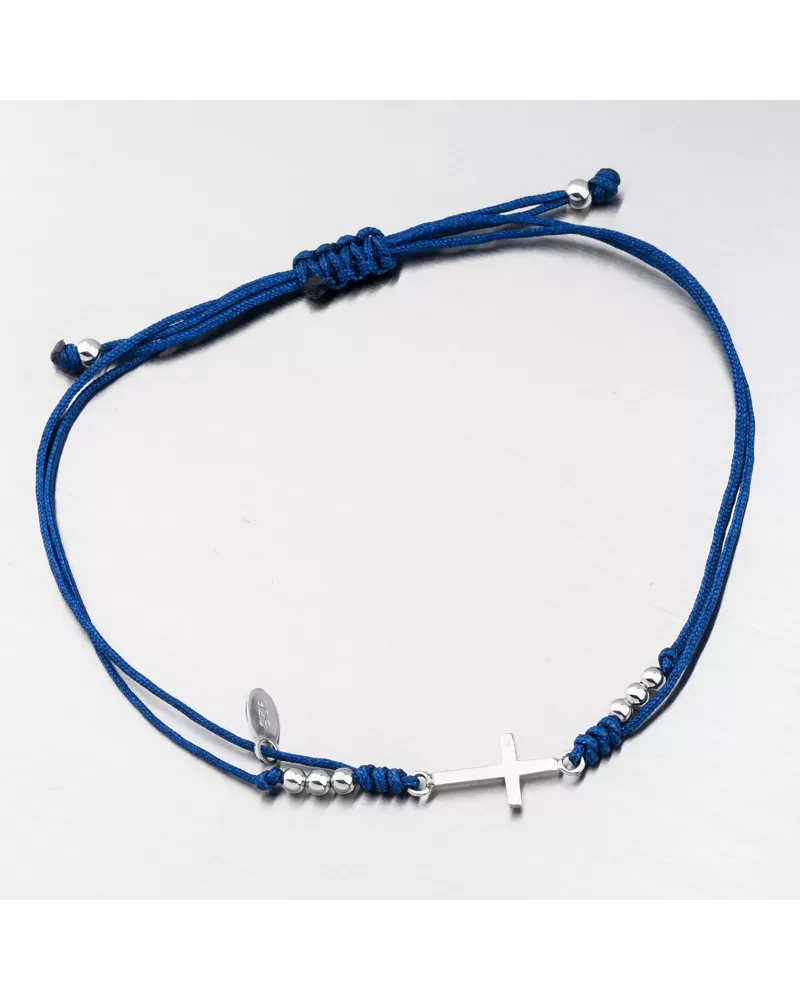 Veľmi populárny typ náramku struny, ktorý má výhodu vo svojej univerzálnej veľkosti a tiež vhodnosť pre obe pohlavia. Náramok pozostáva z modrej dvojitého struna, ktorý je zdobený v strede krížom a potom na každej strane troch strieborných guličiek. Gule sú tiež na koncoch šnúrky.