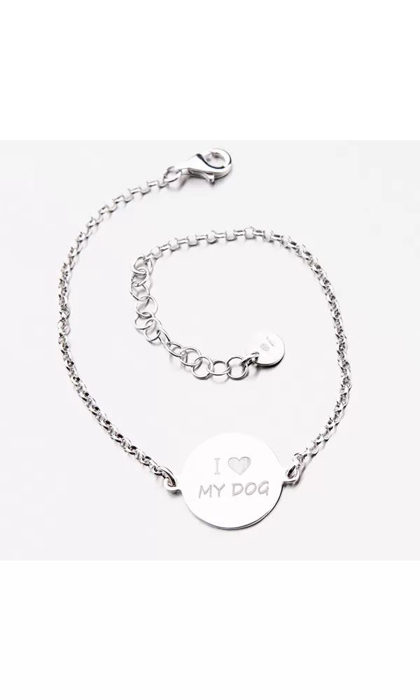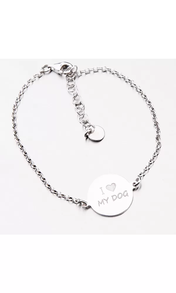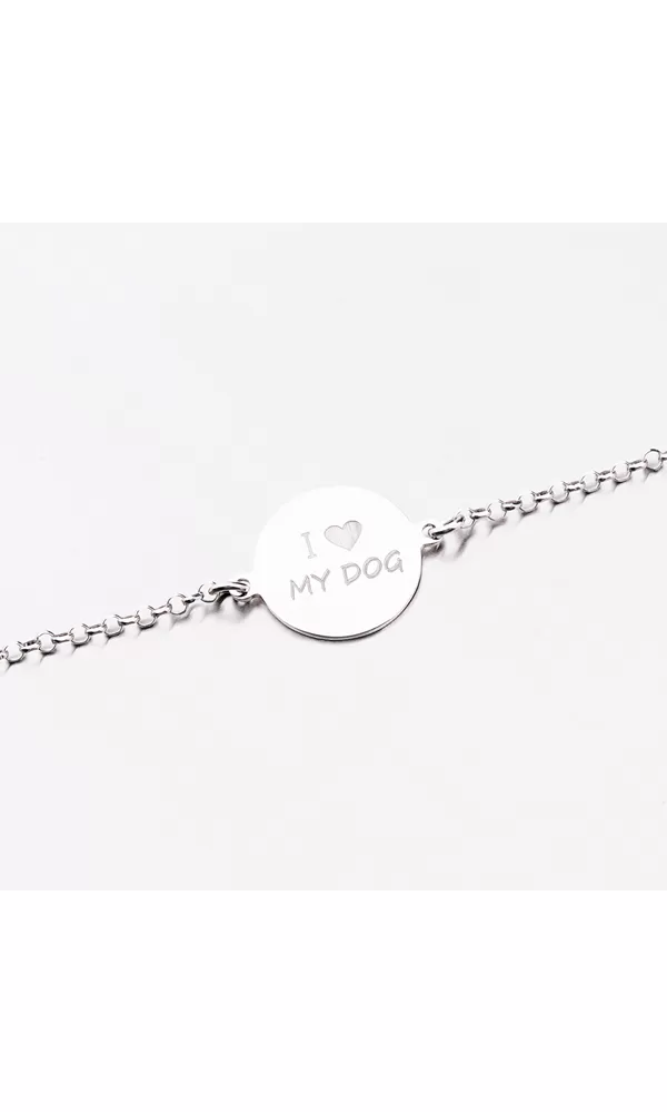 Strieborný náramok je zdobený lesklou placičkou, ktorá je z jednej strany hladká a z druhej strany zdobená nápisom I love my dog. Dĺžka náramku je 17 cm s využitím prídavnej retiazky s dĺžkou 3 cm je možné náramok zapnúť až na dĺžku 20 cm. Na zadnú stranu prívesku je možné nechať vyryť dátum, venovanie či iný Vami zvolený text
