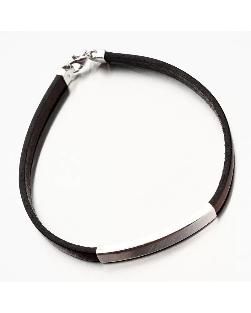 Pánsky náramok je vyrobený z hnedej kože, ktorú zdobí strieborné zdobenie v lesklej úprave, na ktorú si môžete nechať vygravírovať čokoľvek. Môžete si nechať vygravírovať vami vybraný text, napríklad meno alebo písmeno. Do gravírovacieho poľa zadajte popis rytiny. Náramok sa zapína na karabínku.