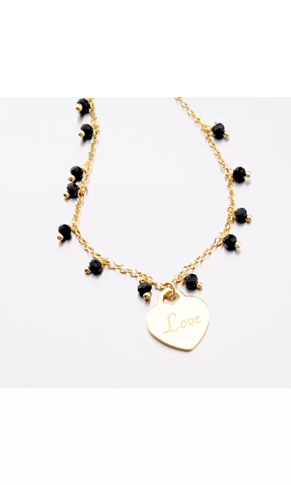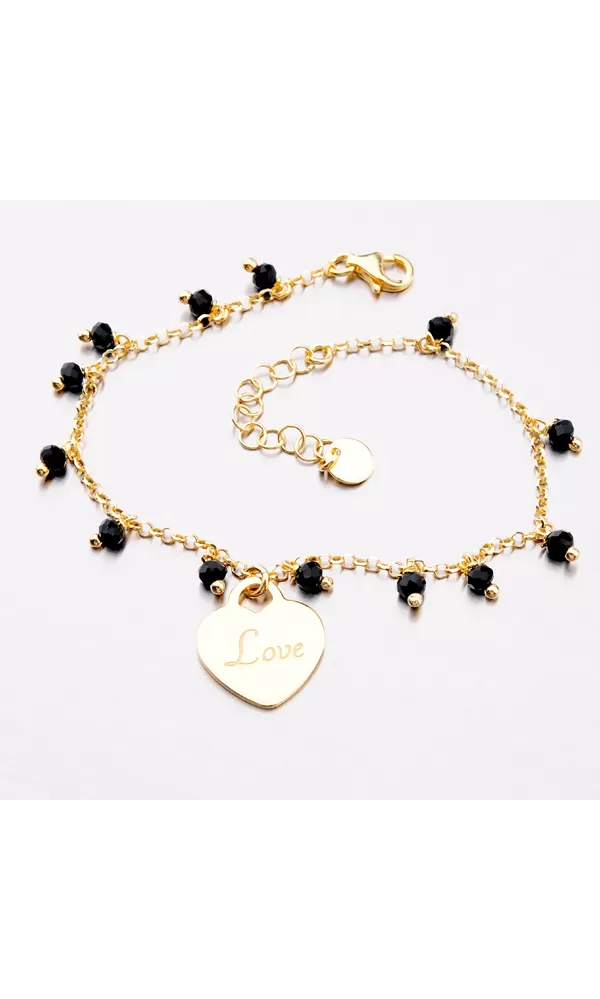 Ozdobte svoje zápästie pozláteným náramkom, ktorý svoju farbu získal vďaka PVD zlateniu. Prednosťou zlatenia technológií PVD je vysoká tvrdosť a odolnosť proti oteru! Ide o hrubú vrstvu, ktorá preniká do pôvodného materiálu. Zlatenie technológií PVD sa dá porovnať s približne 12 mikrónmi galvanického zlatenia, čo je vysoká hodnota, ktorá pri bežnom nosení vydrží až 12 rokov. Náramok je zdobený korálkami v čiernej farbe a príveskom v tvare srdca. Srdce zdobí nápis Love. Dĺžka náramku je 17 cm s využitím prídavnej retiazky s dĺžkou 3 cm je možné náramok zapnúť až na dĺžku 20 cm. Strieborný náramok sa zapína na karabínu.