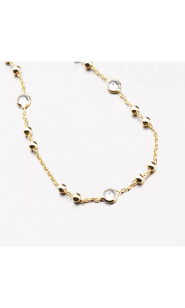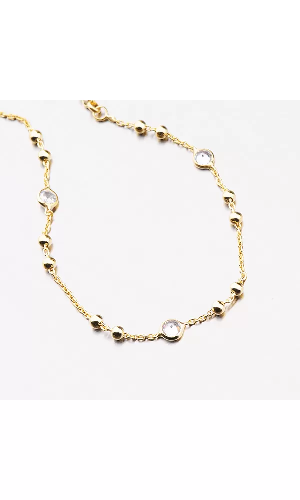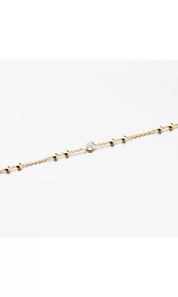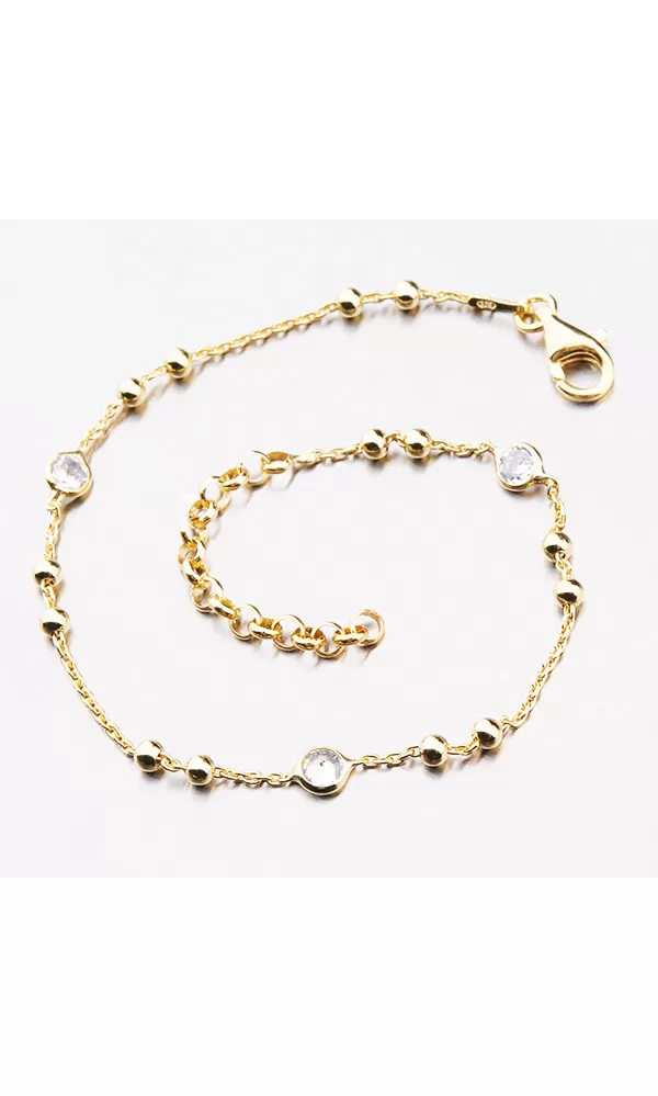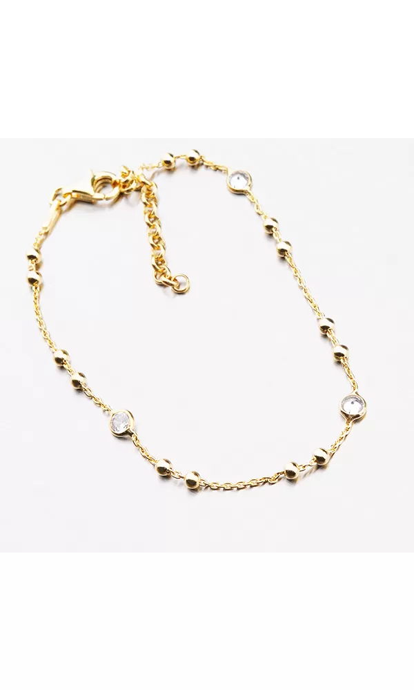 Jemný náramok je zdobený guľami a zirkónmi v brilantnom strihu. Náramok je pozlátený technikou PVD v žltej farbe zlata. Výhodou pozlátenia PVD technológií je vysoká odolnosť proti tvrdosti a oderu! Je to hrubá vrstva, ktorá preniká do pôvodného materiálu. Technológie PVD sa dajú porovnávať s približne 12 mikrónmi galvanického zlatovania, čo je vysoká hodnota, ktorá trvá až 12 rokov pri normálnom opotrebení. Dĺžka náramku je 17 cm pomocou reťazca 3 cm, je možné zapnúť náramok v dĺžke 17 až 20 cm. Náramok je vyrobený zo striebra s čistotou 925/1000 v lesklom povrchu a povrch náramku je rafinovaný Rhodia.  Náramok je zapnutý do karabínu.