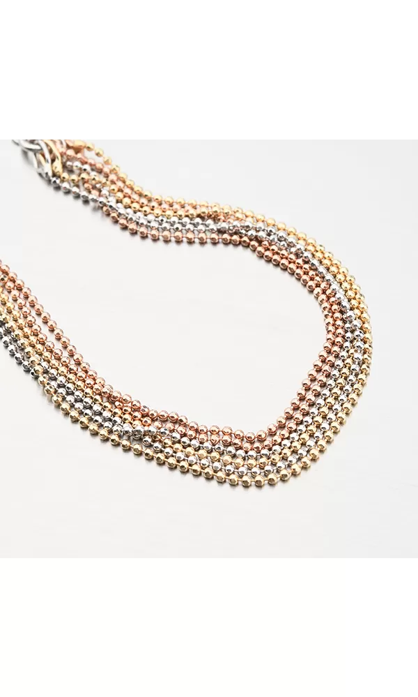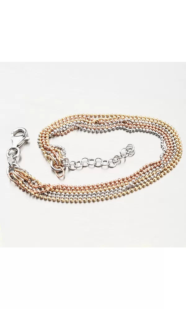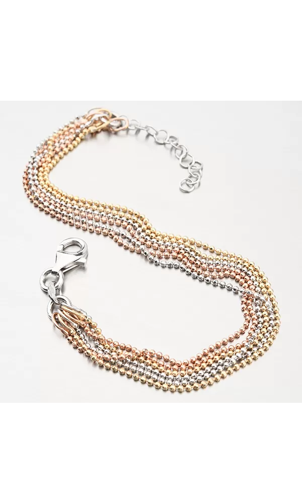 Luxusný náramok v prevedení s trblietavými drobnými guličkami, ktoré sú zdobené facetami. Facety sú lesklé plôšky robené pomocou nástroja s diamantovým hrotom. Facety vďaka svojej vlastnosti odrážajú svetlo, dodávajú celému šperku maximálny lesk a brilanciu zo všetkých uhlov. Žltú a ružovú farbu zlata mu dodáva technika zlatenia PVD. Prednosťou zlatenia technológií PVD je vysoká tvrdosť a odolnosť proti oteru! Ide o hrubú vrstvu, ktorá preniká do pôvodného materiálu. Zlatenie technológií PVD sa dá porovnať s približne 12 mikrónmi galvanického zlatenia, čo je vysoká hodnota, ktorá pri bežnom nosení vydrží až 12 rokov.