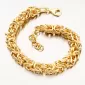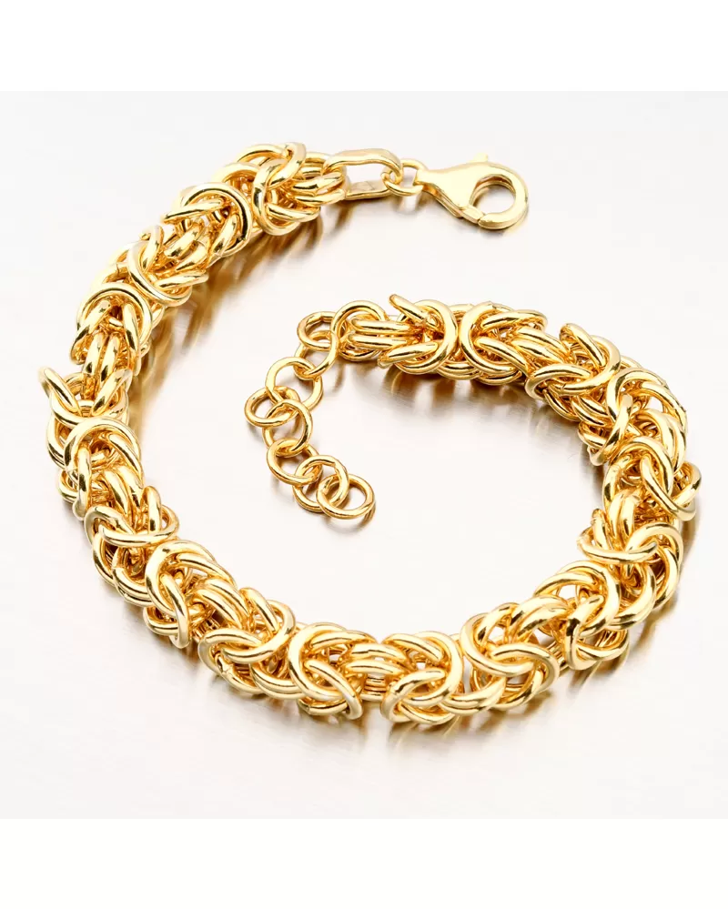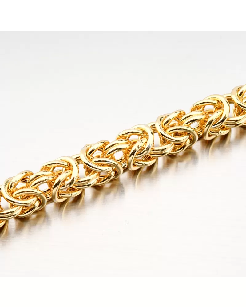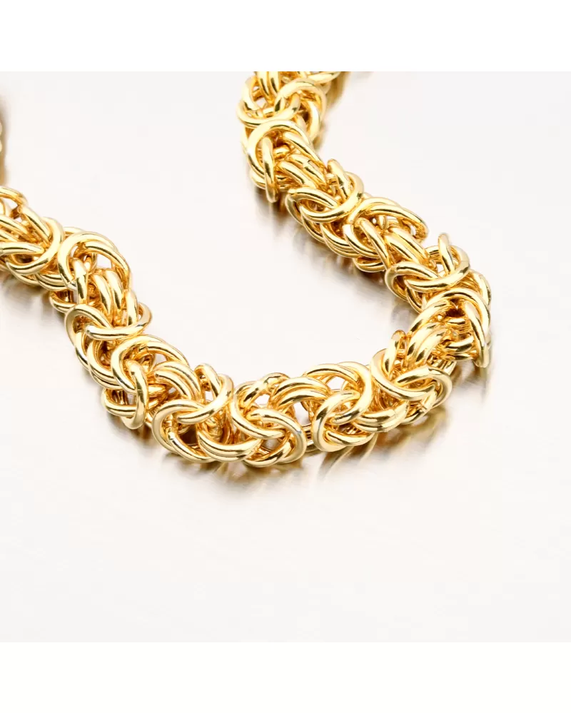 Mohutný unisex náramok pletený do kráľovskej väzby. Náramok je pevný, dutý a so zapínaním na karabínu. Žltú farbu zlata náramku dodáva technika zlatenia PVD. Prednosťou zlatenia technológií PVD je vysoká tvrdosť a odolnosť proti oteru! Ide o hrubú vrstvu, ktorá preniká do pôvodného materiálu. Zlatenie technológií PVD sa dá porovnať s približne 12 mikrónmi galvanického zlatenia, čo je vysoká hodnota, ktorá pri bežnom nosení vydrží až 12 rokov.