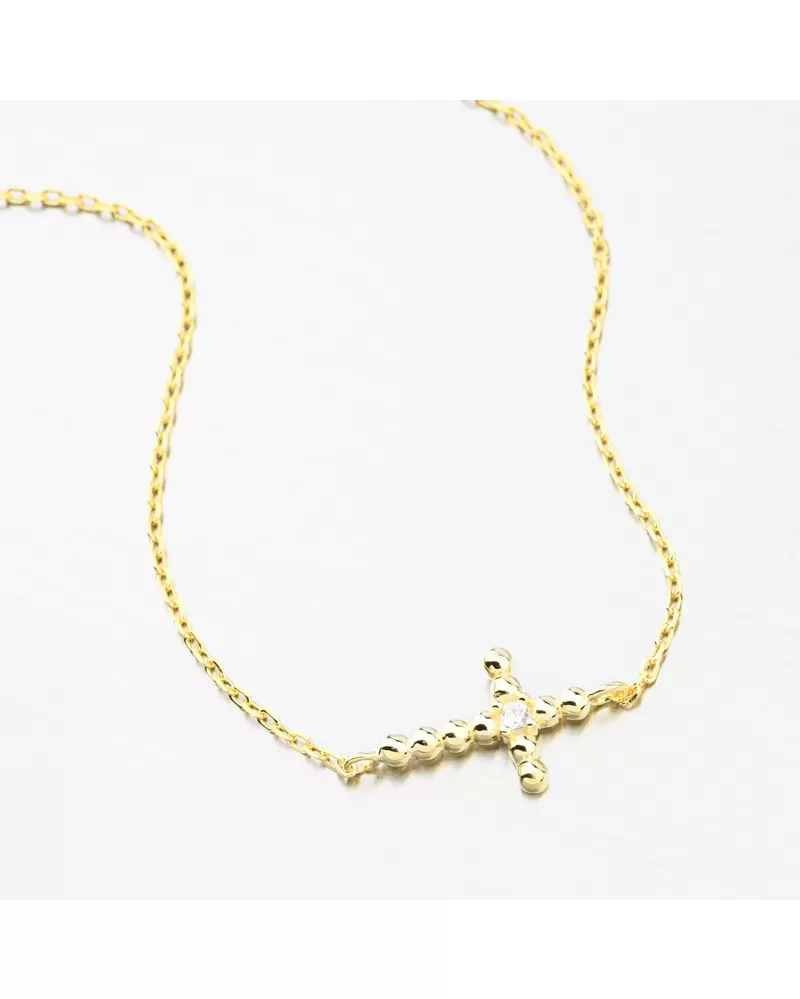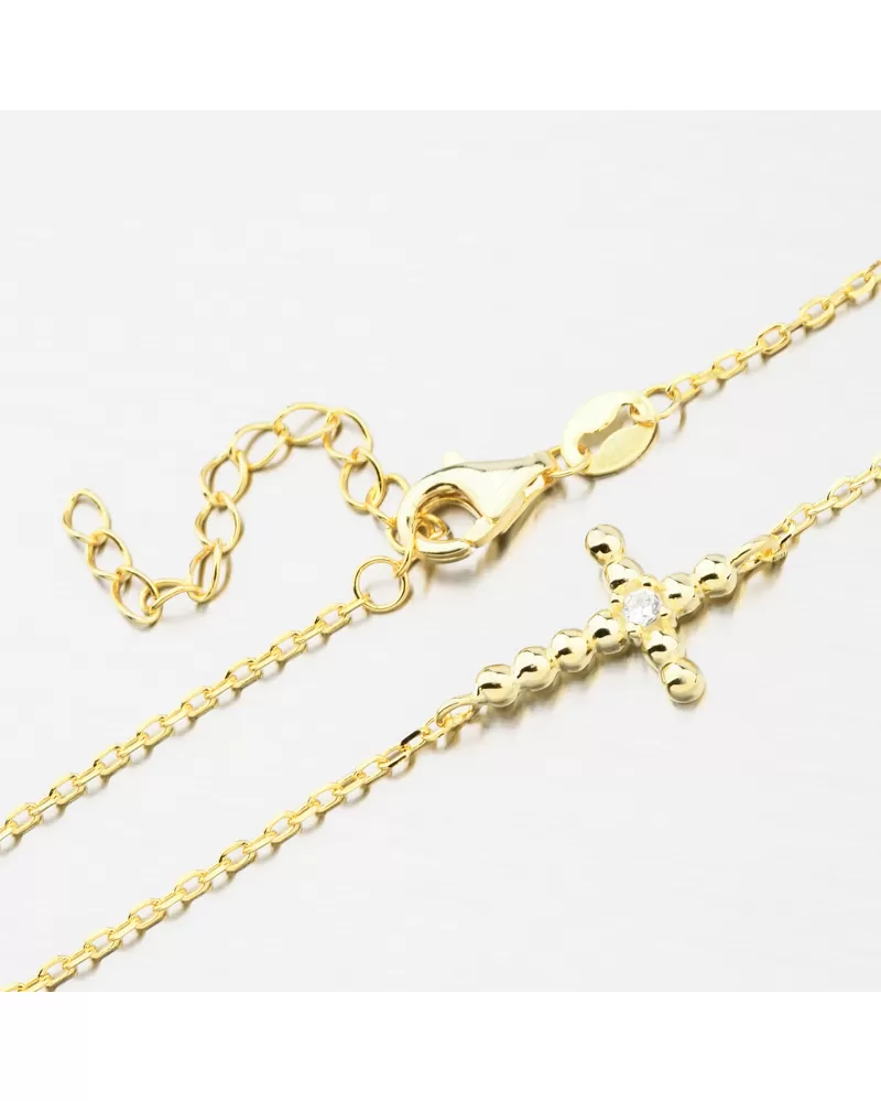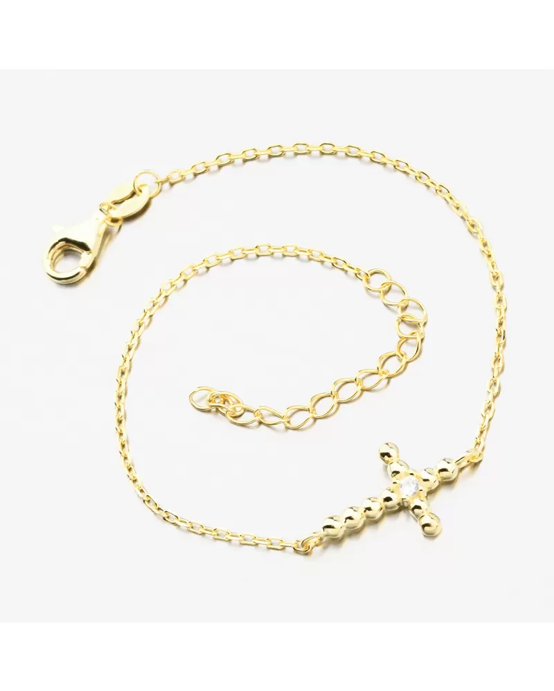 Jemný a elegantný náramok, ktorý je vo svojom strede ozdobený krížikom av jeho centre sa nachádza nádherný trblietavý zirkón. Zirkón je briliantového brusu, ktorý mu dodáva dokonalú brilanciu, skvele odráža svetlo a krásne žiari z každého uhla pohľadu. Zapínanie je na karabínu.