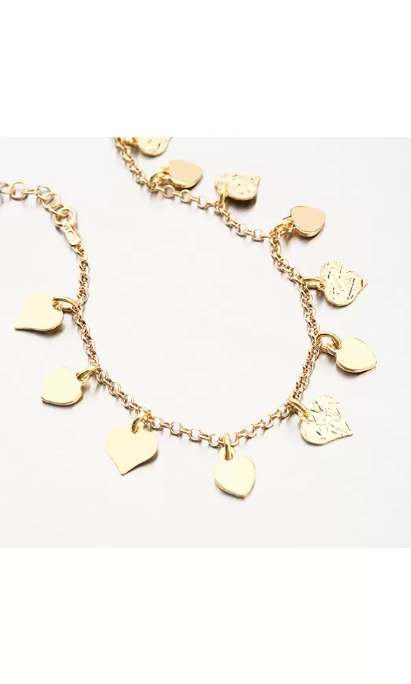Módny dámsky náramok zdobený príveskami so srdiečkami. Väčšie srdiečka sú zdobené gravírovaním z oboch strán a menšie srdiečka sú žiarivo lesklé.