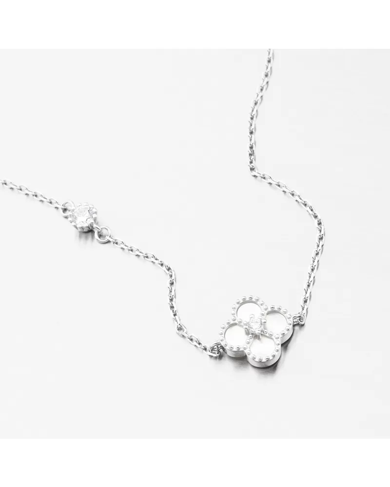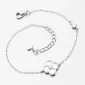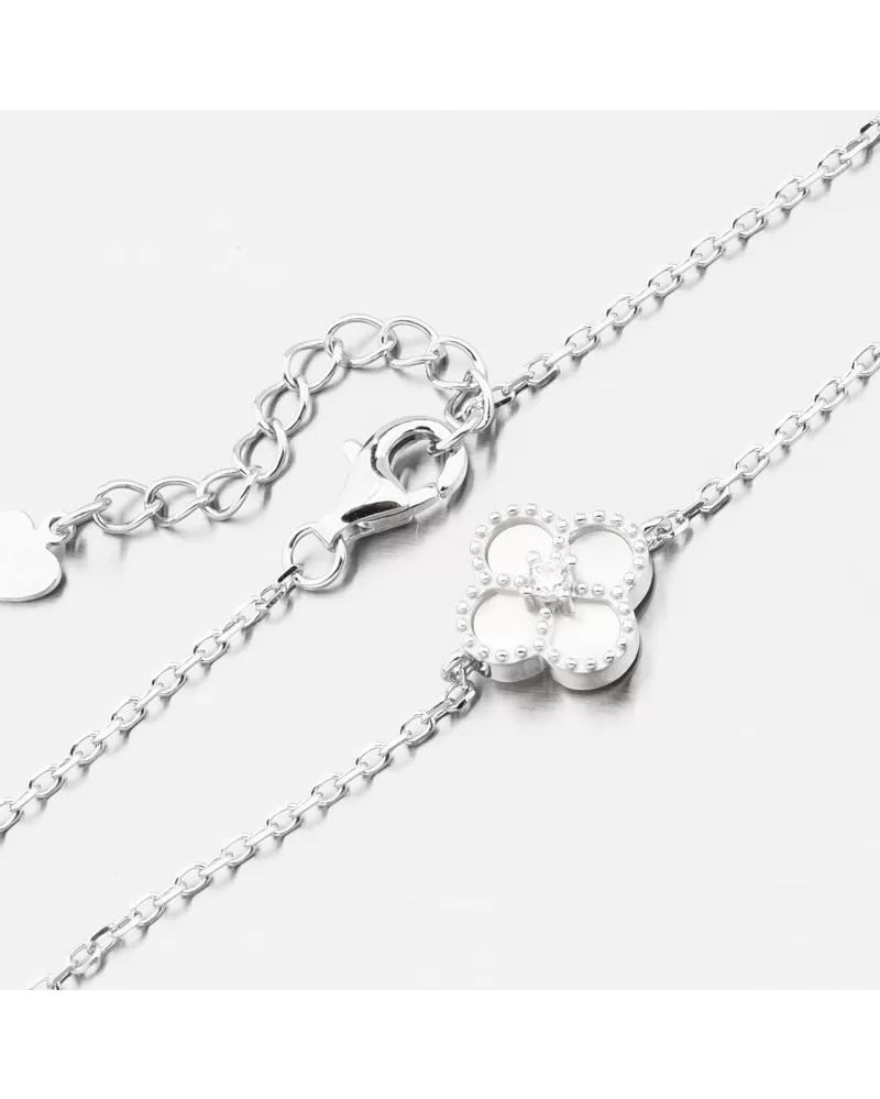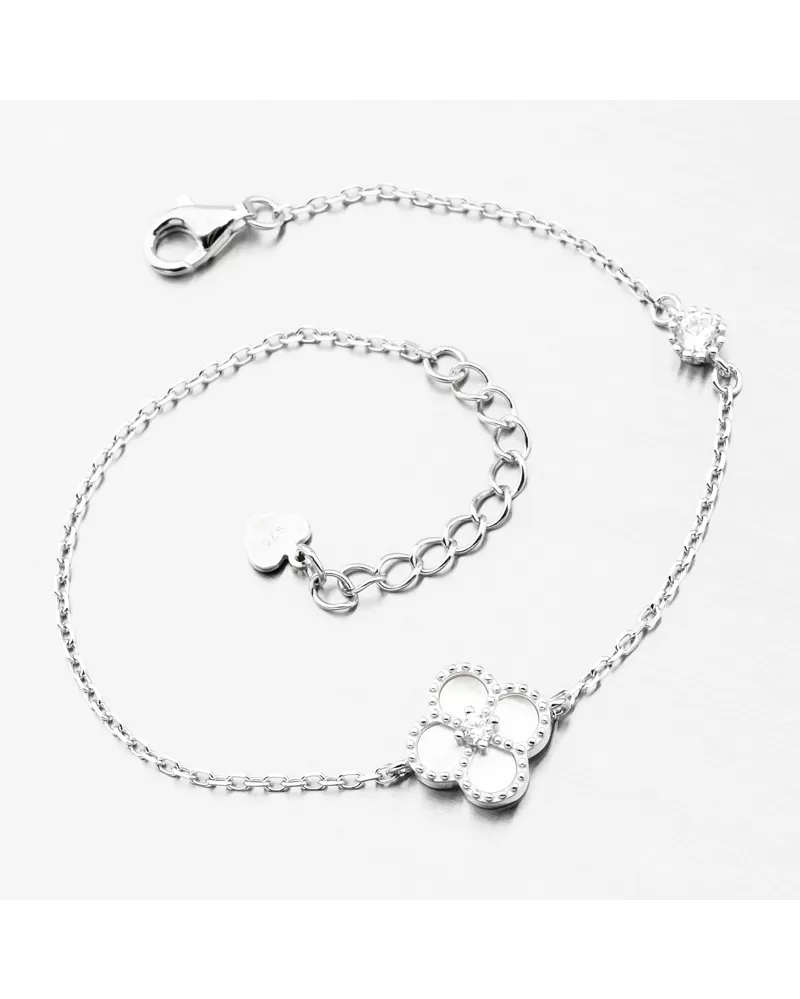 Slušivý strieborný náramok pre ženy alebo dievčatá, ktoré majú rady jemné a elegantné šperky. Náramok tvorí retiazku typu anker a zdobí ju ozdoba v tvare štvorlístka, ktorú dekoruje pôvabná perleť a zirkón vsadený doprostred štvorlístka. Ďalší výrazný zirkón nájdete kúsok od karabínky. Zirkóny sú briliantového brúsu. Tento brús prepožičiava zirkónom brilanciu pravých diamantov, ktorý podporí aj konštrukciu náramku.