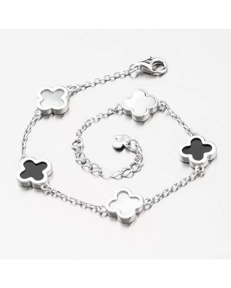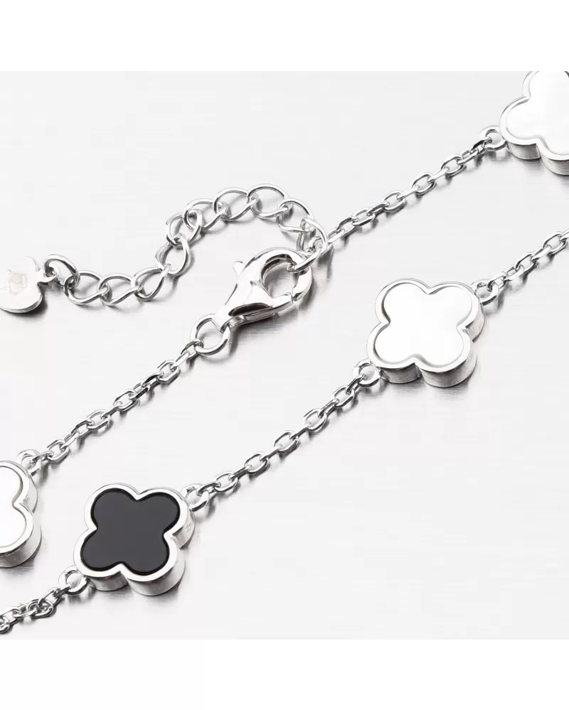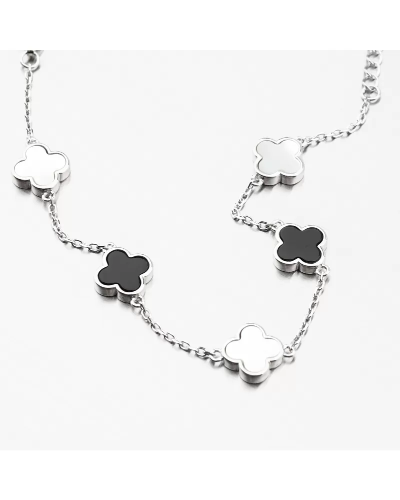 Slušivý strieborný náramok pre ženy či dievčatá, ktoré majú rady jemné a elegantné šperky. Náramok tvorí retiazku typu anker a zdobia ho ozdoby v tvare štvorlístka. Strieda sa tu čierna farba s perleťovo bielou farbou. Farba je vidieť z oboch strán, nezáleží teda ako si náramok zapnete alebo by sa pretočil.