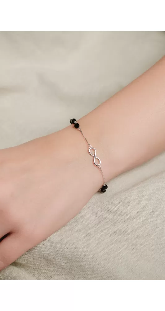 Moderný náramok s obľúbenými čiernymi guličkami, ktoré sú brúsené a trblietajú sa do všetkých strán. V strede náramku sa nachádza symbol nekonečno. Tento strieborný náramok je jemný a bude pohodlný aj po celodennom nosení.