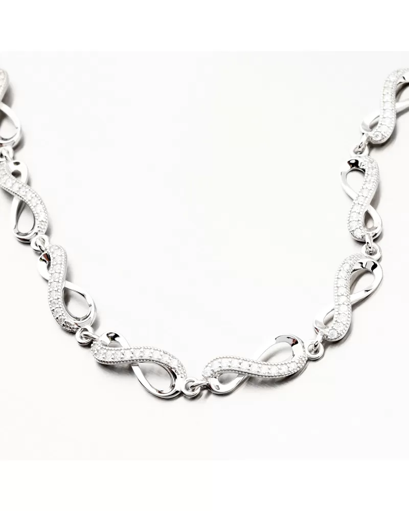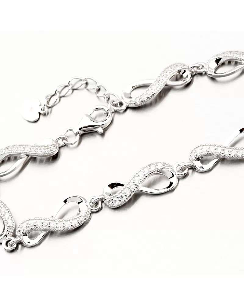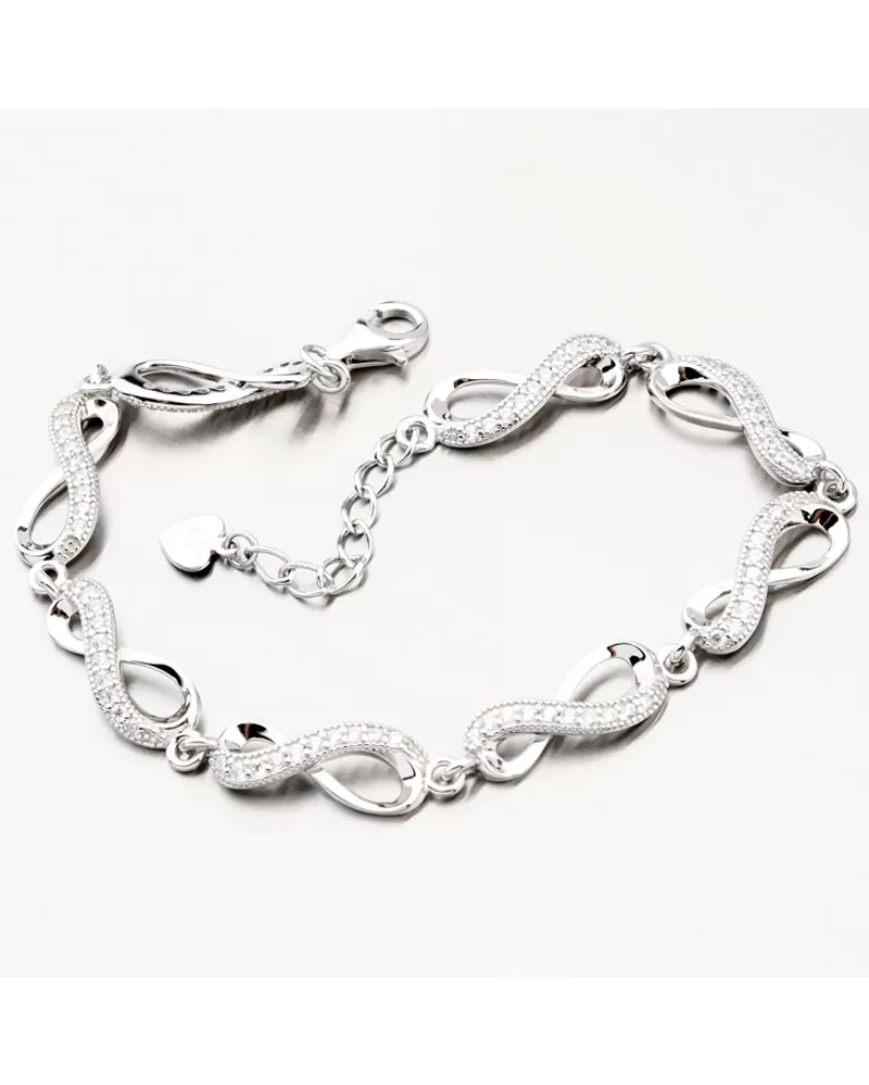 Elegantný strieborný náramok, ktorým zaručene zažiarite na každej spoločenskej udalosti alebo inej príležitosti. Náramok je tvorený dielikmi v tvare nekonečna. Tieto dieliky sú čiastočne osadené žiarivými zirkónmi briliantového brusu. Tento brus zaisťuje maximálnu brilanciu vybrúsených facet, dokonale odráža svetlo a neuveriteľne žiari z každého uhla pohľadu. Doprajte si tento luxusný náramok alebo urobte radosť svojej drahej polovičke.