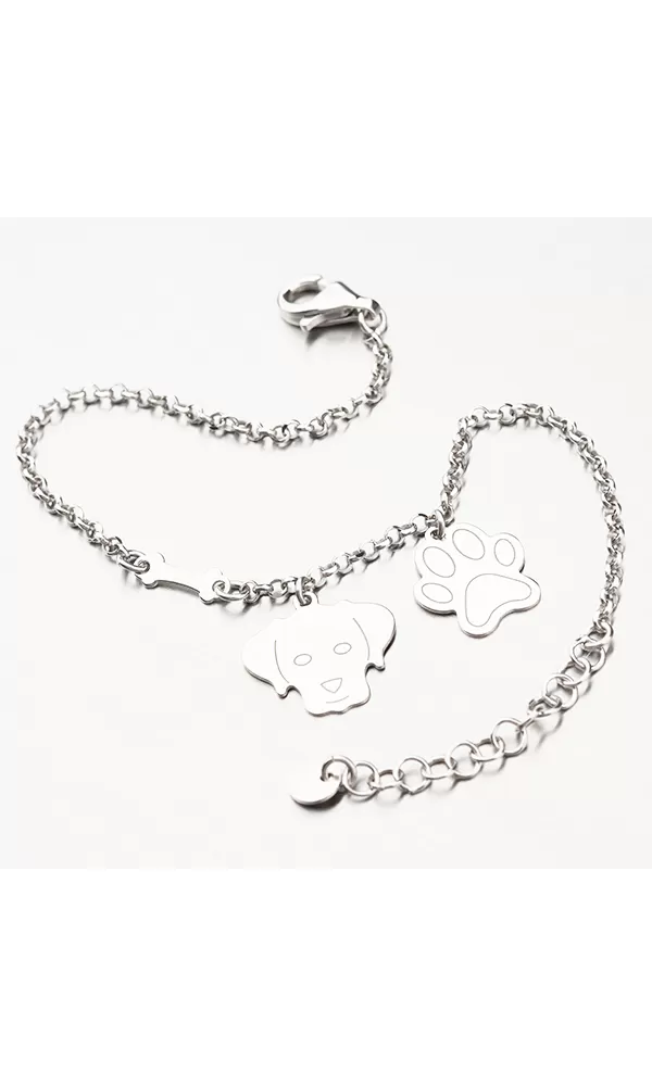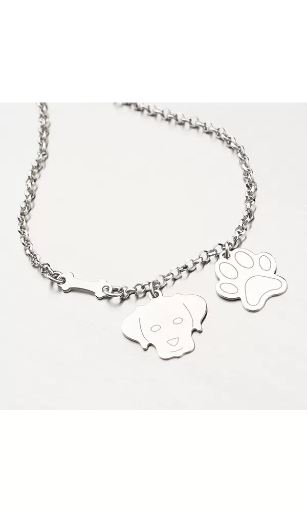 Ideálny darček pre milovníkov psov! Náramok je zdobený kosťou, príveskom ťapky a psou hlavou. Retiazka je typu Anker a je zdobená facetami. Facety sú zhotovené diamantovým nástrojom a dodávajú náramku maximálny lesk, vďaka ktorému dokonale odráža svetlo a majú krásnu brilanciu zo všetkých uhlov pohľadu! Z druhej strany príveskov je možné vyryť Vami vybraný text ako je napríklad meno psíka, dátum narodenia - popis rytiny uveďte do kolónky špeciálne požiadavky.