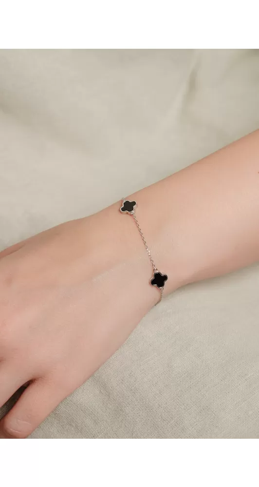 Náramok, ktorý očarí hneď na prvý pohľad. Náramky so štvorlístkom sú obľúbeným symbolom šťastia, nádeje a pozitívnej energie. Náramok má retiazku typu anker a zdobia ho ozdoby v tvare štvorlístka v čiernej farbe.