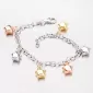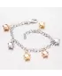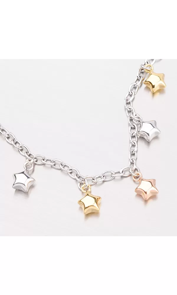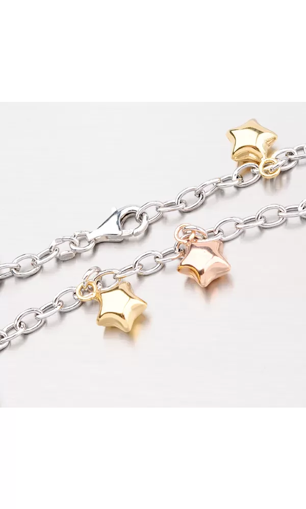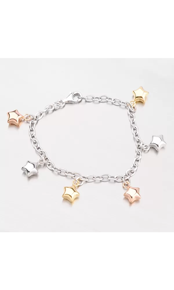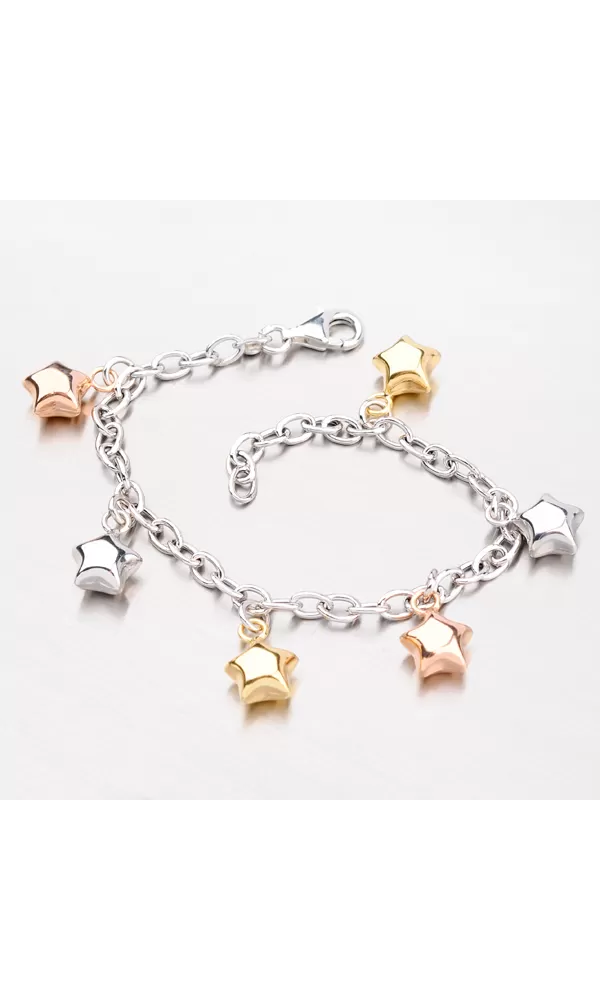 Tento veľmi krásny náramok je vyrobený zo striebra o rýdzosti 925/1000 a je zdobený šiestimi hviezdičkami s rôznou povrchovou úpravou. Celý náramok je rhodiovaný ak tomu sú dve hviezdičky pozlátené žltým zlatom a dve zlatom červeným. Ródium je ušľachtilý drahý kov zo skupiny platinových kovov. Rhodiovaním strieborných šperkov galvanickým nanášaním tohto drahého platinového kovu sa stáva povrch šperku tvrdší, stálejší a odolnejší voči vonkajším vplyvom ako je mechanický oter, poškriabanie, nabiehanie striebra, ľudský pot, kozmetické prípravky a ďalšie. Ródium je antialergické.