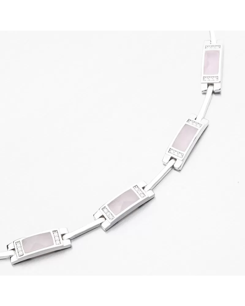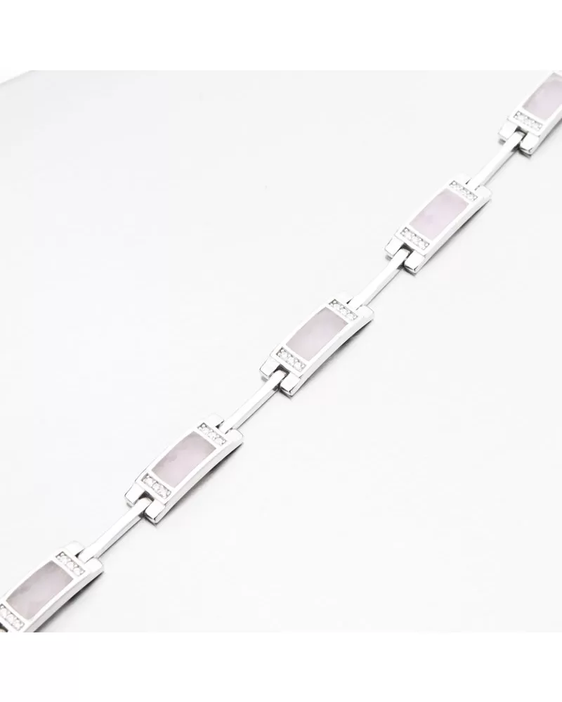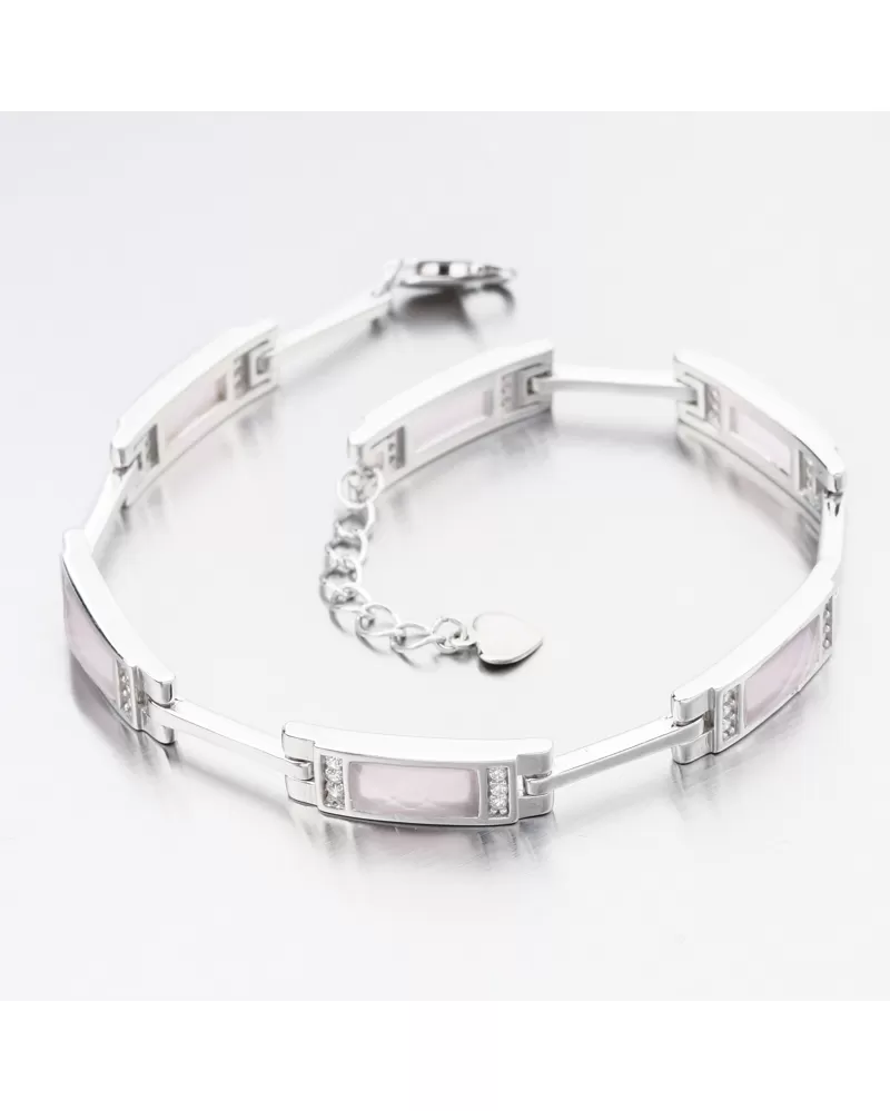 Chystáte sa kúpiť náramok, ktorý zdôrazní vašu krásu? Tento náramok bude bezkonkurenčnou dekoráciou pre všetky ženy. Náramok je lemovaný ozdobami so štvorcovými, ktoré sú zdobené syntetickým ružovým kremeňom a potom na stranách bielych zirkónov brilantného strihu. Tento rez poskytuje maximálnu brilanciu pozemnej stránky, dokonale odráža svetlo a z každého pohľadu neuveriteľne svieti.