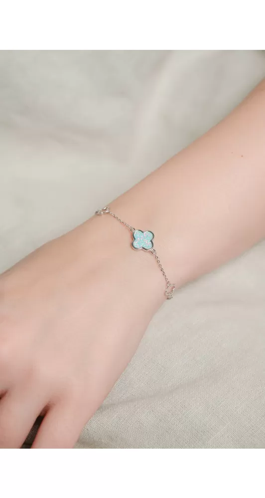 Očarujúce náramok so svetlo kapustovým opálom, ktoré sa pýši unikátnymi farebnými odleskami. Syntetický opál je usadený do ozdoby v strede do tvaru štvorlíštku. Potom sú na náramku ešte dva menšie štvorlístky vo vysokom lesku.