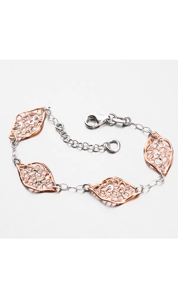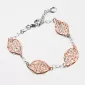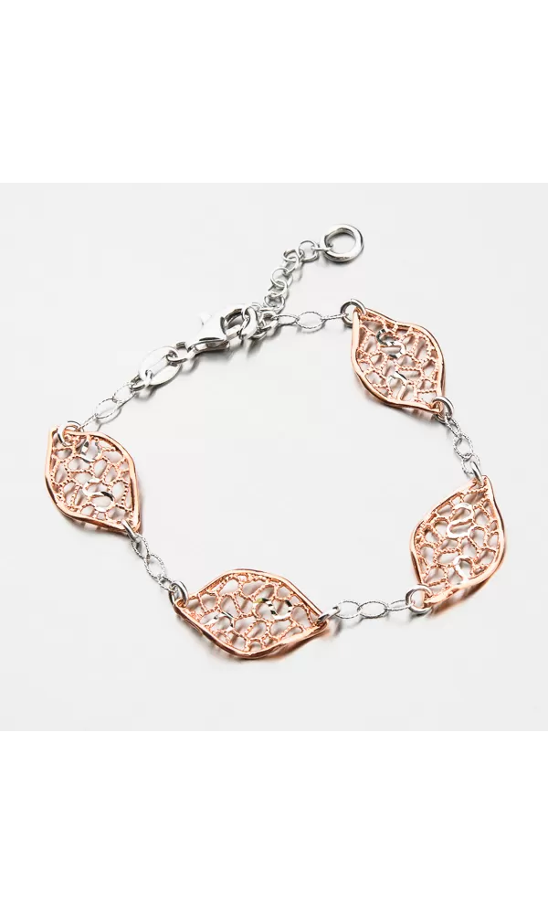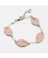 Náramek vás zaujme na první pohled originálním designem. Je doplněn o čtyři lístky, které jsou pozlaceny v barvě růžového zlata a místy jsou zdobeny gravírováním, kde diamantový hrot rycího nástroje zajišťuje neuvěřitelně vysoký lesk. Přívěsek tedy krásné reaguje s vaším pohybem a se světlem se třpytí neuvěřitelným leskem. Délka náramku je 17 cm ale s použití přídavného řetízku lze náramek zapnout až na délku 20 cm. Náramek se zapíná karabinou.