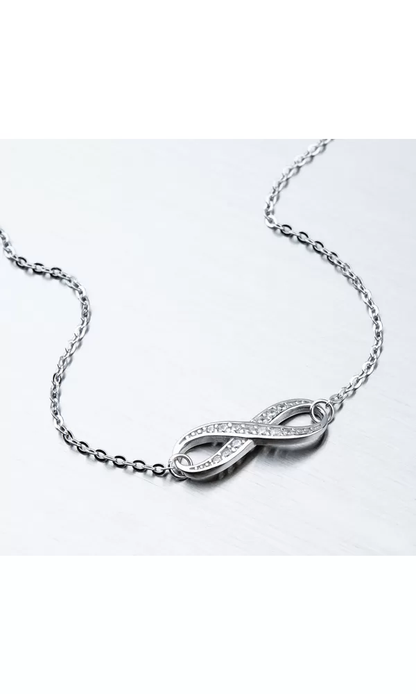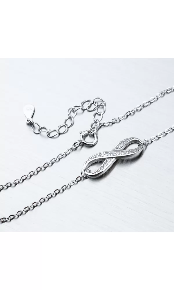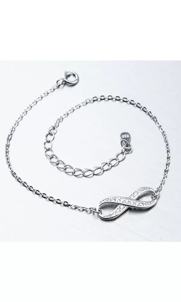 Hľadáte náramok pre mamičku, kamarátku, alebo priateľku?. Tak tento ich určite poteší. Náramok je zdobený príveskom, ktorý znázorňuje nekonečno. Ležatá osmička je ľahko prehnutá tak, aby dokonale splynula rukou. Prívesok nekonečno je zdobené zirkónmi v briliantovom bruse. Náramok sa zapína na perový krúžok. Dĺžka náramku je 16 cm, s využitím retiazky 4 cm, je možné náramok zapnúť v dĺžke 16 až 20 cm. Náramok je vyrobený zo striebra o rýdzosti 925/1000 v lesklej povrchovej úprave a povrch náramku je zušľachtenýrhodiovaním