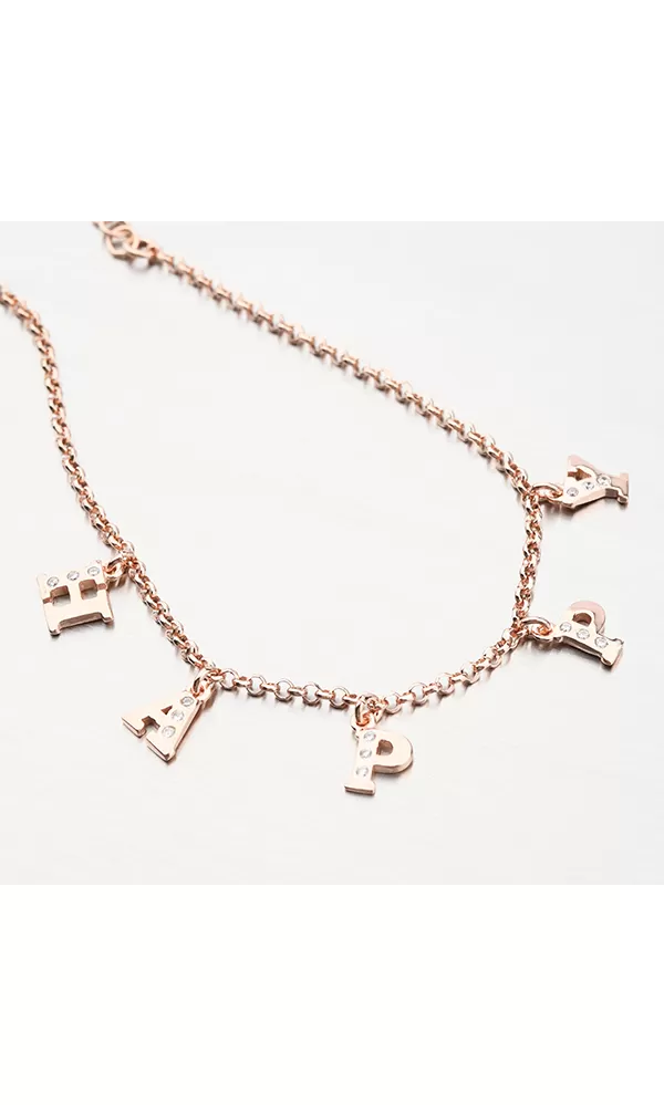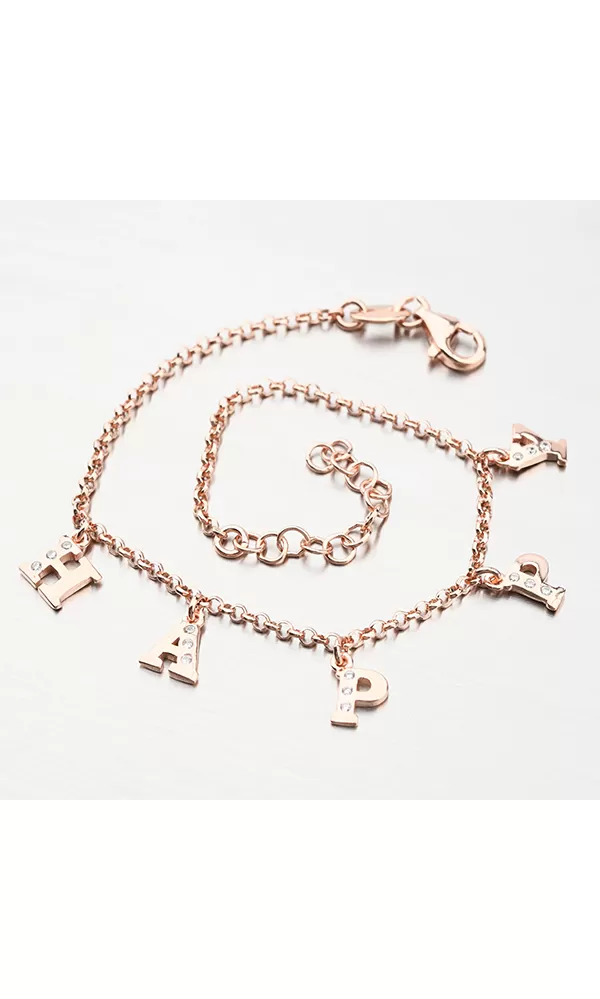 Žiarivý náramok s písmenkami, ktoré dohromady dávajú nápis HAPPY - alebo ŠŤASTNÝ. Jednotlivé písmenká sú zdobené žiarivými zirkónmi. Ružovú farbu zlata náramku dodáva technika zlatenia PVD. Prednosťou zlatenia technológií PVD je vysoká tvrdosť a odolnosť proti oteru! Ide o hrubú vrstvu, ktorá preniká do pôvodného materiálu. Zlatenie technológií PVD sa dá porovnať s približne 12 mikrónmi galvanického zlatenia, čo je vysoká hodnota, ktorá pri bežnom nosení vydrží až 12 rokov.
