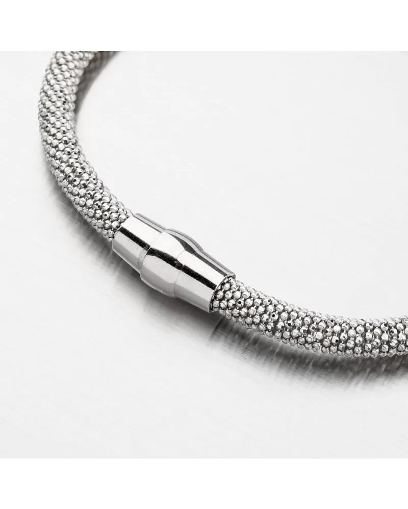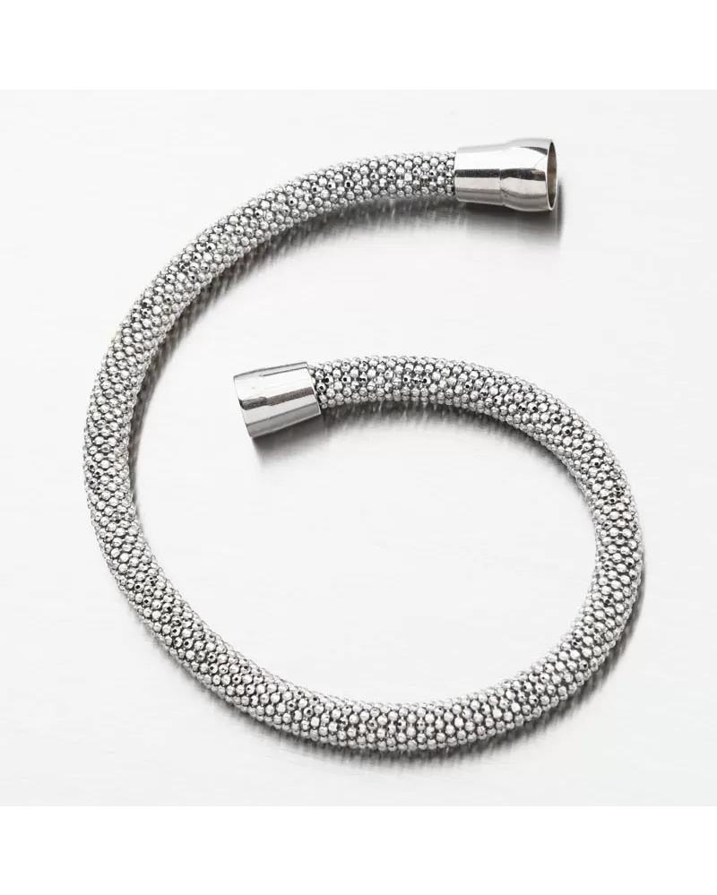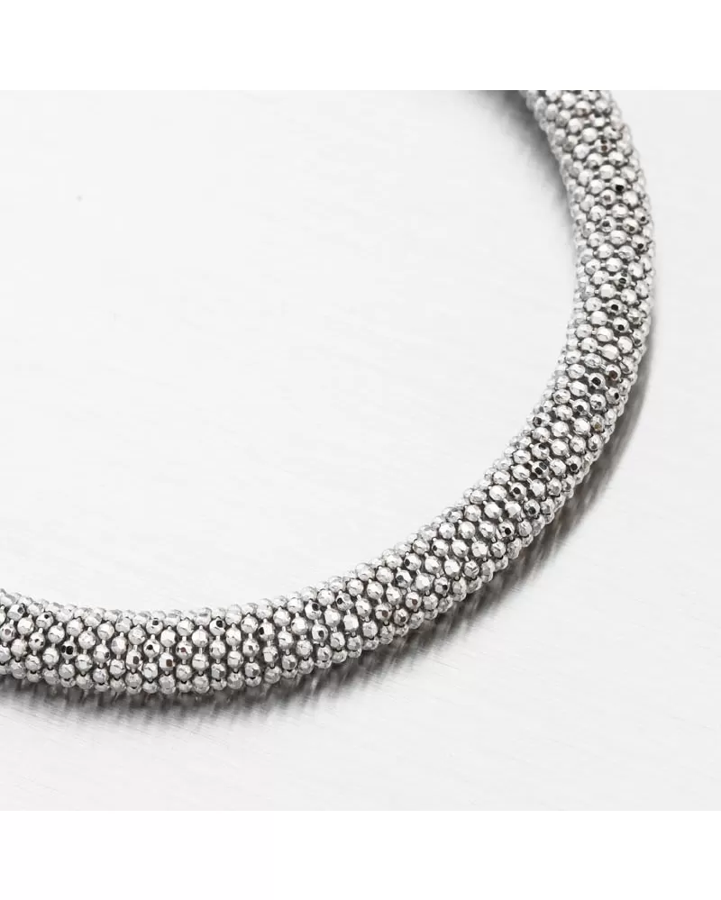 Luxusný náramok tvorený z prepletených drobných guličiek zdobených facetami-gravírovaním. Facety sú zhotovené diamantovým nástrojom, ktorý dodáva vzniknutým facetám maximálny lesk, vďaka ktorému dokonale odráža svetlo a majú krásnu brilanciu zo všetkých uhlov pohľadu! Ozdobte svoje zápästie žiarivým šperkom.