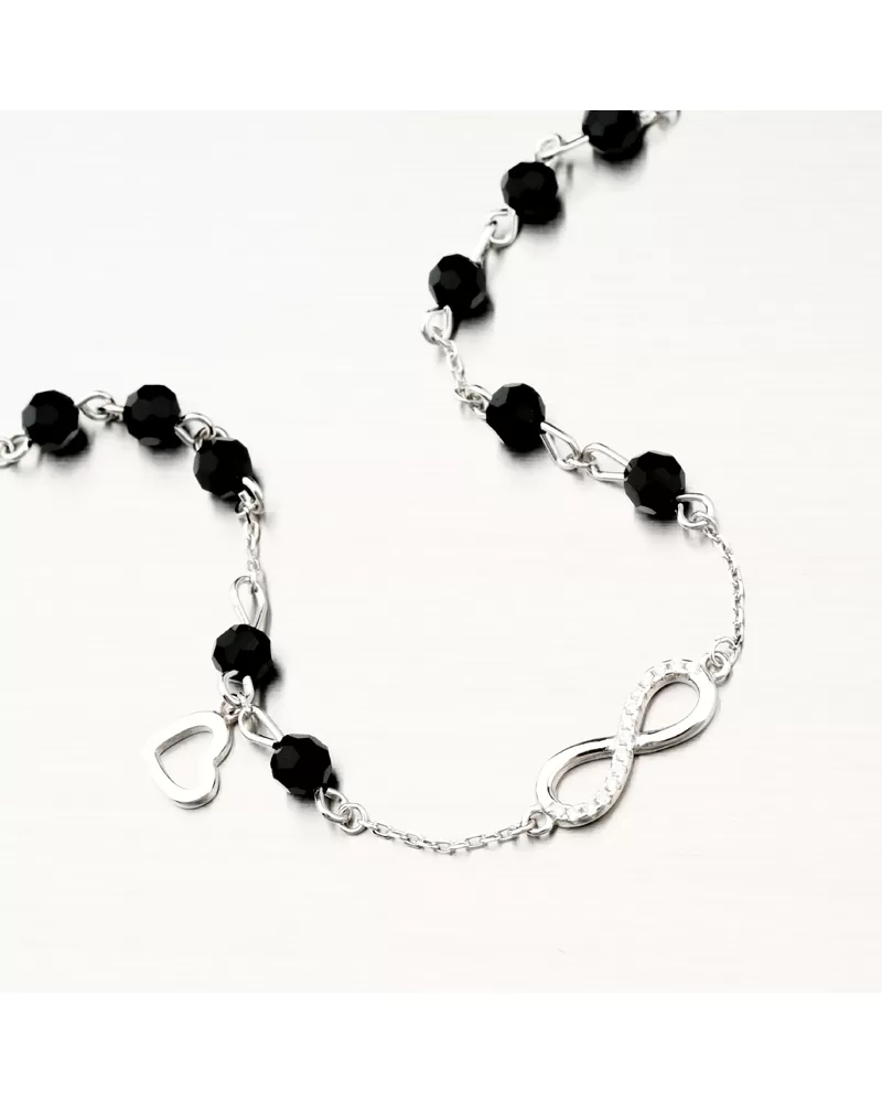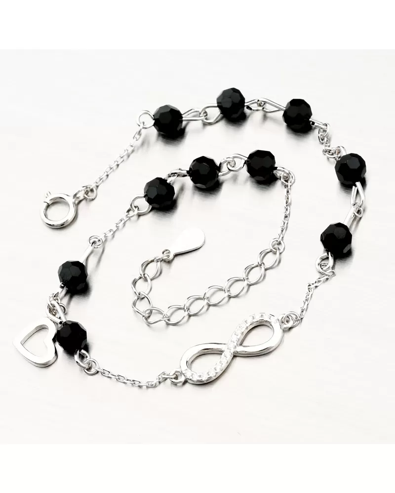 Moderný náramok s obľúbenými čiernymi zirkónmi v tvare brúsenej guličky. V strede náramku sa nachádza symbol nekonečno, ktoré je čiastočne osadené… Celý popis