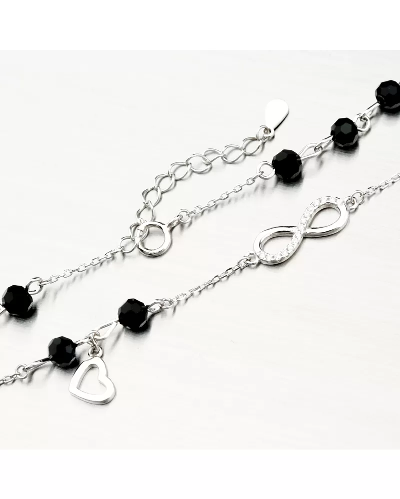 Moderný náramok s obľúbenými čiernymi zirkónmi v tvare brúsenej guličky. V strede náramku sa nachádza symbol nekonečno, ktoré je čiastočne osadené bielymi zirkónmi briliantového brusu. Tento brús prepožičiava zirkónom brilanciu pravých diamantov, ktorý podporí aj konštrukciu náušníc. Tento strieborný náramok je jemný a bude pohodlný aj po celodennom nosení.