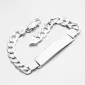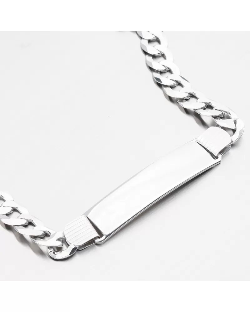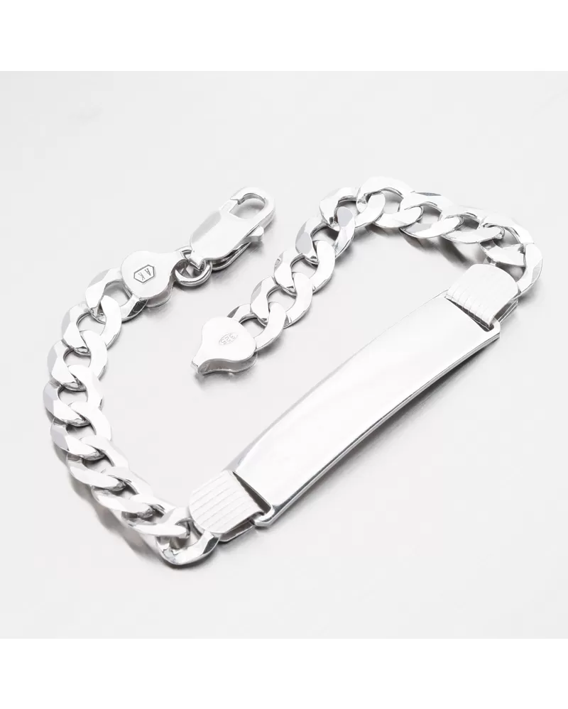 Pánsky náramok sa skladá z reťazového panačníka a taniera, ktorý sa nachádza v strede. Reťaze so vzorom panacera sú vyrobené z plochých očí, ktoré sa pozorne zmestia a vytvárajú rovný a hladký povrch. Výsledkom je, že tento typ reťazca je nielen veľmi odolný voči roztrhnutiu, ale aj veľmi príjemným nosením. Doska ich jemne vyhlasuje za maximálne pohodlie opotrebenia. Doska je možné vyzdobiť rytím, aby ste vytvorili originálny darček, ktorý každý človek oceňuje. Na tanier môžete vyzdvihnúť svoj vybraný text, napríklad meno alebo písmeno. Uveďte popis gravírovania v políčku špeciálne požiadavky. Zapnite strieborný náramok s masívnou karabínou.