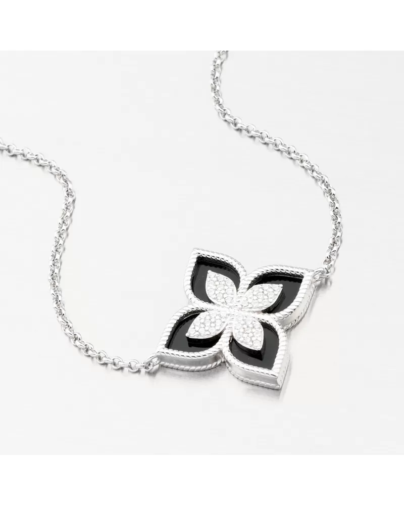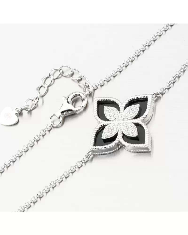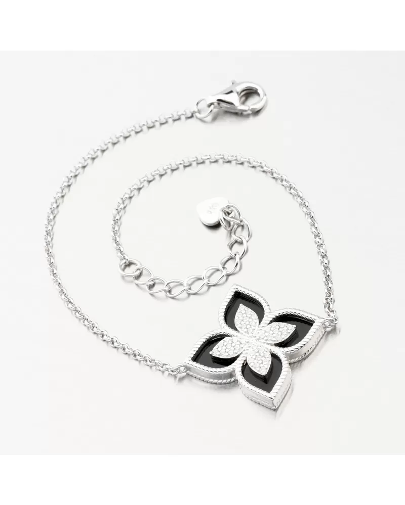 Nádherný strieborný náramok pre ženy alebo dievčatá, ktoré majú rady jemné a elegantné šperky. Náramok zdobí stredová časť v tvare kvety, ktorou dekoruje čierna farba a zirkóny vsadené v strede kvety. Zirkóny sú briliantového brúsu. Tento brús prepožičiava zirkónom brilanciu pravých diamantov, ktorý podporí aj konštrukciu náramku.