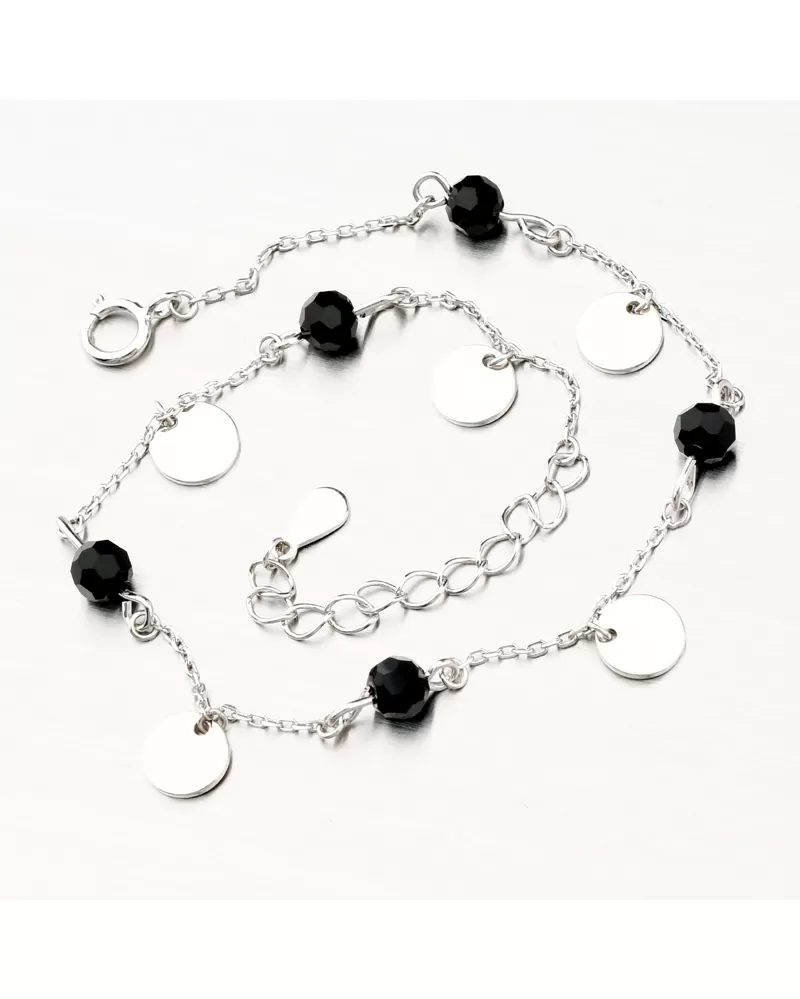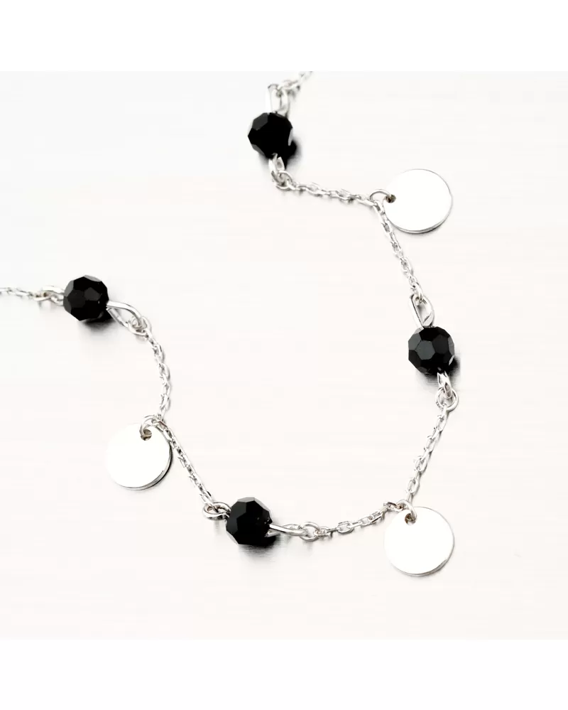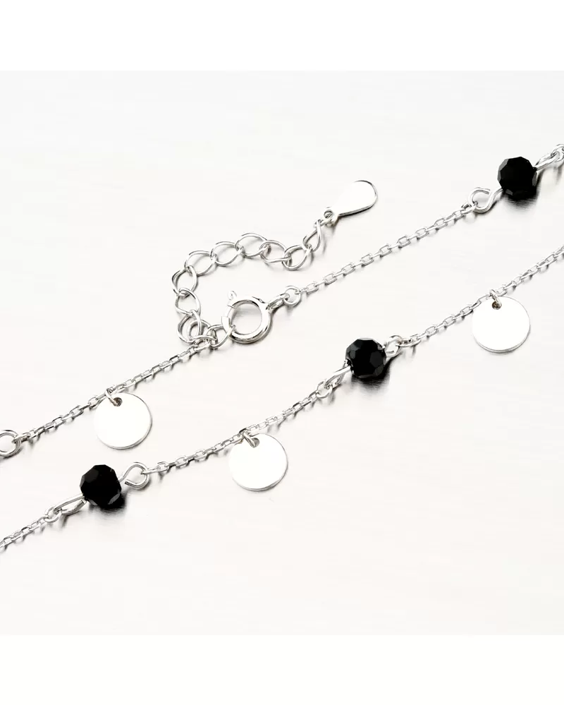 Moderný náramok s obľúbenými čiernymi zirkónmi v tvare brúsenej guličky. Náramok tvorí veľmi jemná retiazka typu anker a potom sa na nej striedajú čierne brúsené guličky spoločne so striebornými okrúhlymi plackami vo vysokom lesku. Tento strieborný náramok je jemný a bude pohodlný aj po celodennom nosení.