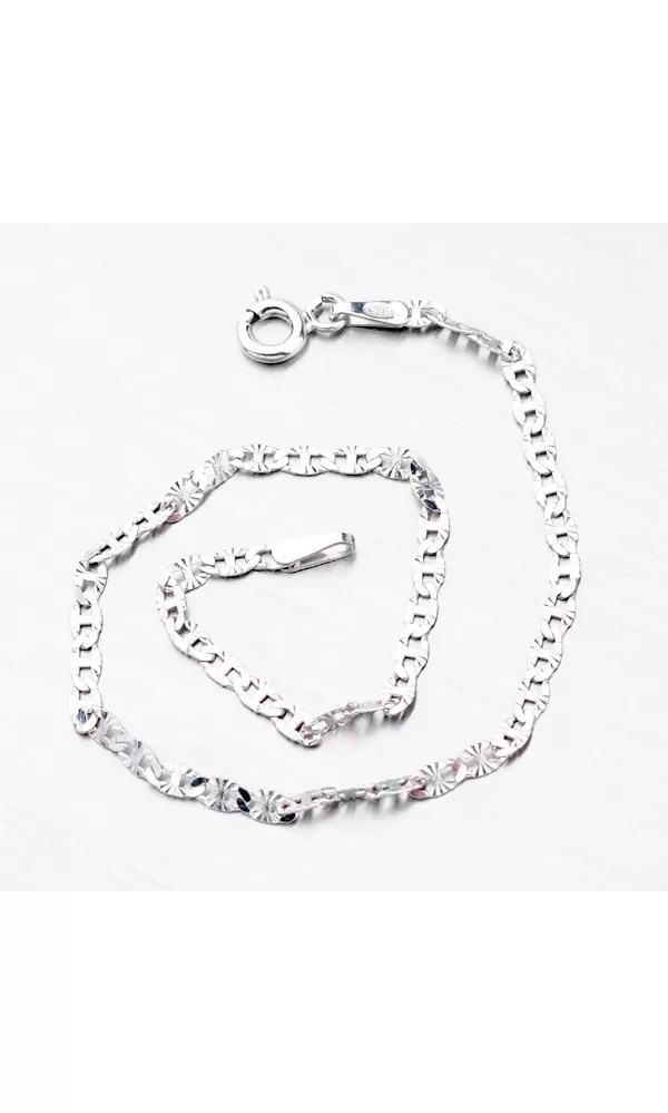 Nádherný náramok zo striebra s rýdzosťou 925/1000 s povrchovou úpravou facet, ktoré zaručujú maximálny lesk a brilanciu náramku. Facety sú robené pomocou diamantového nástroja. Náramok sa skladá z oválnych očiek, ktoré majú uprostred priečku a tvoria tak tvar podobný osmičke. Pre vysokú odolnosť náramku je jeho povrch zušľachtený rhodiovaním. Ródium je ušľachtilý drahý kov zo skupiny platinových kovov. Rhodiovaním strieborných šperkov galvanickým nanášaním tohto drahého kovu sa stáva povrch šperku tvrdší, stálejší a odolnejší voči vonkajším vplyvom ako je mechanický oter, poškriabanie, nabiehanie striebra, ľudský pot, kozmetické prípravky a ďalšie. Ródium je antialergické.
