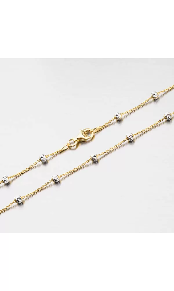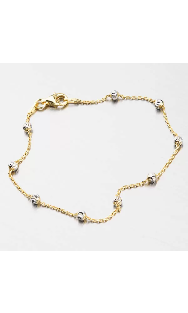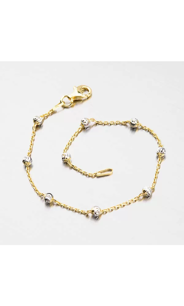 Jemný a zdobený dámsky náramok vám dokonale ozdobí zápästie. Náramok je zložený z klasickej retiazky a prívesky vo forme guličiek, ktoré sa pravidelne opakujú. Retiazka je upravená technikou zlatenia PVD, ktorá dodá retiazku odolnosť a farbu žltého zlata. Guličky sú zvýraznené gravírovaním, ktoré im dodáva lesk. Dámsky náramok je vyrobený zo striebra o rýdzosti 925/1000 v lesklej povrchovej úprave. Strieborný náramok zapnete karabínou.