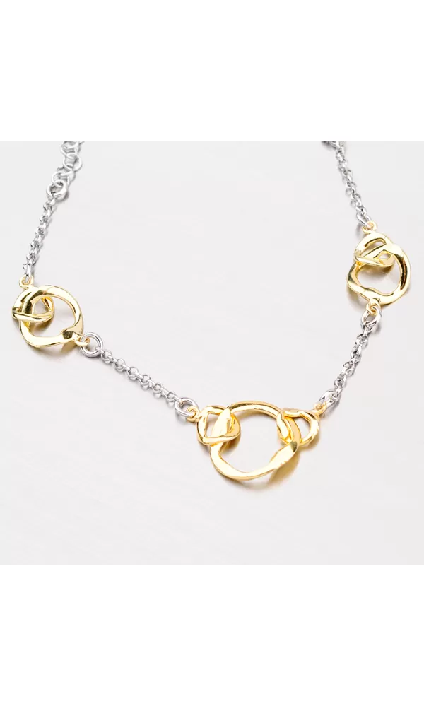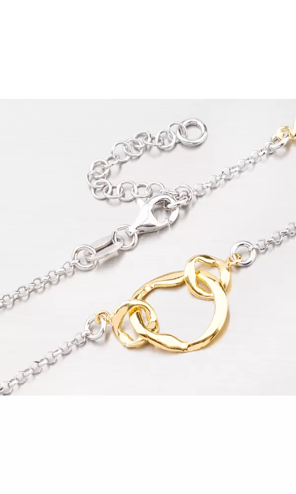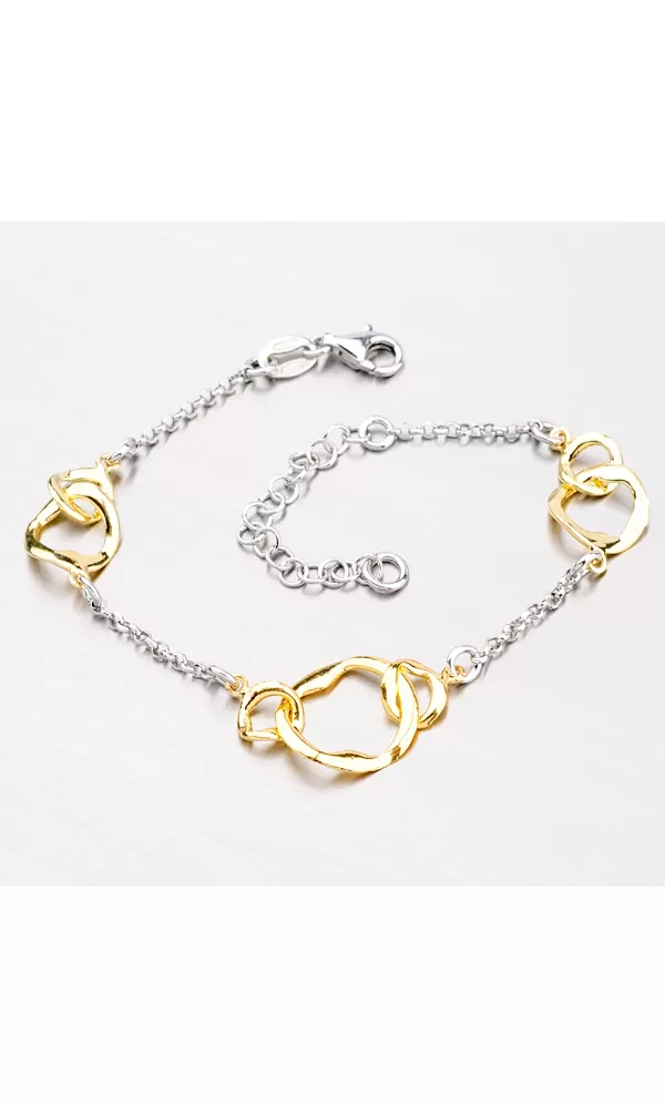 Tento veľmi krásny náramok je vyrobený zo striebra o rýdzosti 925/1000 a je zdobený pozlátenými krúžkami. Náramok je možné zapnúť na veľkosť 16 cm a vďaka pridanému náramku až na veľkosť 20 cm. Celý povrch náramku je zušľachtený rhodiovaním. Ródium je ušľachtilý drahý kov zo skupiny platinových kovov. Rhodiovaním strieborných šperkov galvanickým nanášaním tohto drahého platinového kovu sa stáva povrch šperku tvrdší, stálejší a odolnejší voči vonkajším vplyvom ako je mechanický oter, poškriabanie, nabiehanie striebra, ľudský pot, kozmetické prípravky a ďalšie. Ródium je antialergické.