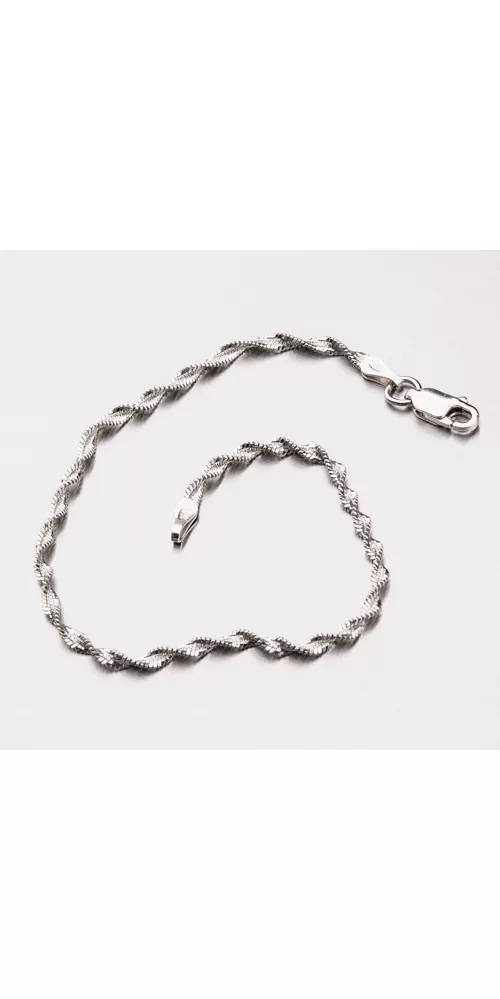Nádherný náramok krúteného štýlu Singapore zo striebra s rýdzosťou 925/1000 s povrchovou úpravou facet, ktoré zaručujú maximálny lesk a brilanciu náramku Facety sú robené za pomoci diamantového nástroja. kov zo skupiny platinových kovov. Rhodiovaním strieborných šperkov galvanickým nanášaním tohto drahého kovu sa stáva povrch šperku tvrdší, stálejší a odolnejší voči vonkajším vplyvom ako je mechanický oter, poškriabanie, nabiehanie striebra, ľudský pot, kozmetické prípravky a ďalšie. >