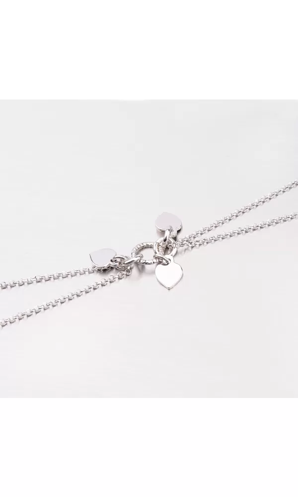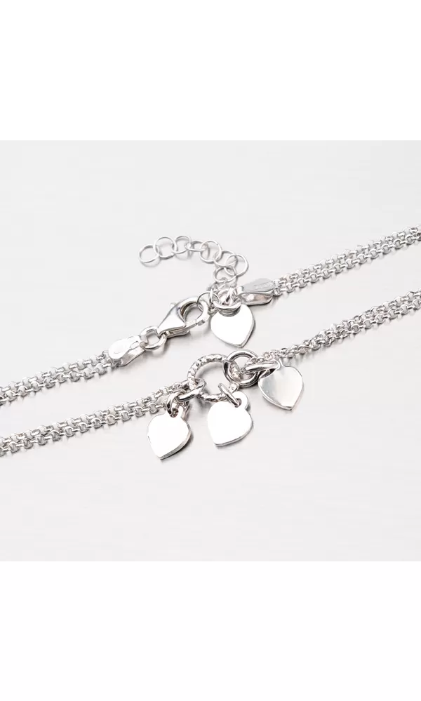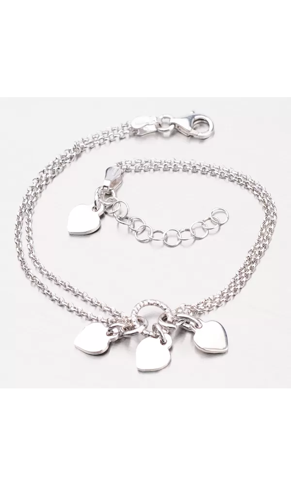 Hľadáte zaujímavý náramok, ktorý vám budú všetci závidieť? Na výrobu tohto náramku je použité striebro o rýdzosti 925/1000 s lesklou povrchovou úpravou. Celý náramok zdobia 4 drobné lesklé srdiečka. Prostredné srdiečko visí na gravírovanom krúžku, ktorý spája dve časti náramku dohromady. Náramok je tvorený dvojitými retiazkami hráškového typu, ktoré sú zdobené gravírovanými facetami robenými za pomoci diamantového nástroja, ktoré dodávajú celému šperku maximálny lesk a brilanciu zo všetkých uhlov pohľadu. Náramok je možné zapnúť na veľkosť 17 cm a vďaka pridanej nastaviteľnej retiazke až na veľkosť 20 cm. Povrch náramku je zušľachtený rhodiovaním. Ródium je ušľachtilý drahý kov zo skupiny platinových kovov. Rhodiovaním strieborných šperkov galvanickým nanášaním tohto drahého platinového kovu sa stáva povrch šperku tvrdší, stálejší a odolnejší voči vonkajším vplyvom ako je mechanický oter, poškriabanie, nabiehanie striebra, ľudský pot, kozmetické prípravky a ďalšie. Ródium je antialergické.