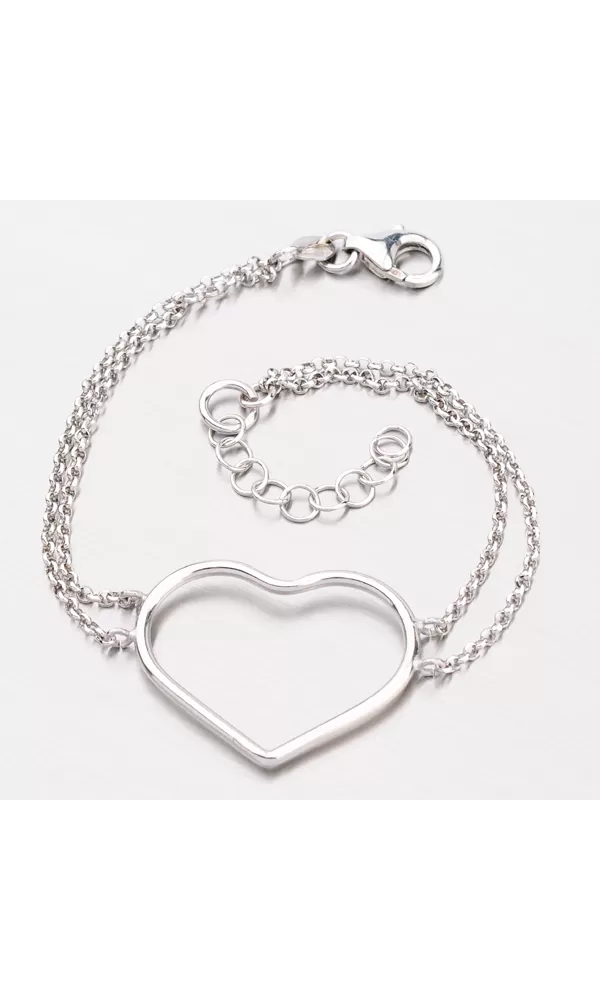 Krásny náramok zdobený veľkým srdiečkom zaujme každého vo vašom okolí. Na výrobu tohto náramku bolo použité striebro o rýdzosti 925/1000 v lesklej povrchovej úprave. Typ náramku je hráškový a je zdobený lesklými facetami robenými za pomoci diamantového nástroja, ktoré dodávajú šperku maximálny lesk a brilanciu zo všetkých uhlov pohľadu. Náramok je možné zapnúť na veľkosť 17 cm a vďaka pridanej retiazke až na veľkosť 20 cm. Povrch náramku je zušľachtený rhodiovaním. Ródium je ušľachtilý drahý kov zo skupiny platinových kovov. Rhodiovaním strieborných šperkov galvanickým nanášaním tohto drahého platinového kovu sa stáva povrch šperku tvrdší, stálejší a odolnejší voči vonkajším vplyvom ako je mechanický oter, poškriabanie, nabiehanie striebra, ľudský pot, kozmetické prípravky a ďalšie. Ródium je antialergické.