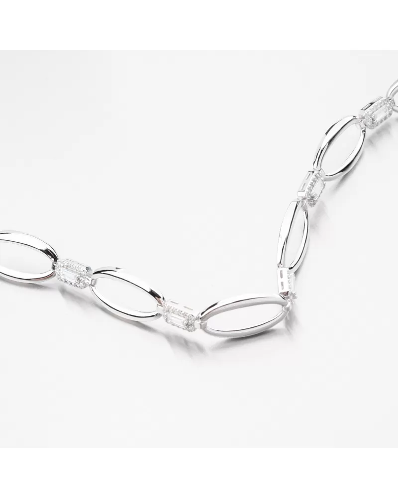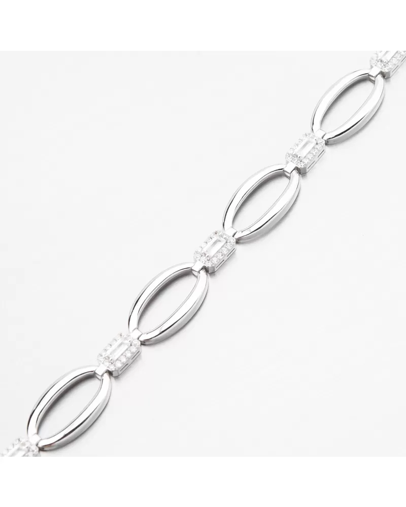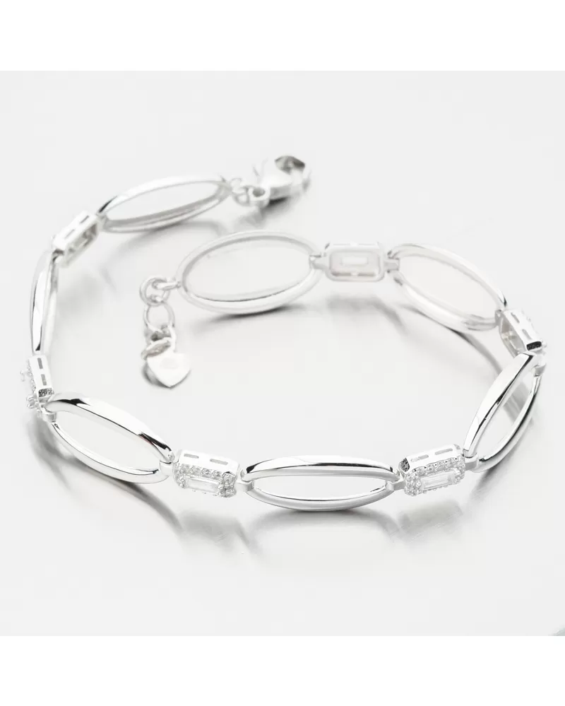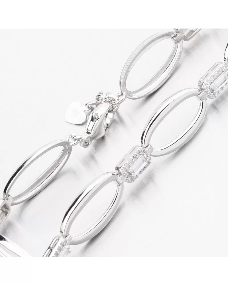 Elegantný strieborný náramok s výraznými zirkónmi, ktoré dodávajú vaše kúzlo. Náramok je zdobený oválnymi ozdobami vo vysokom lesku, ktoré spájajú štvorcové ozdoby s obdĺžnikovým zirkónom a potom sú obložené bielymi okrúhlymi zirkónmi brilantného brúsenia. Tento rez poskytuje maximálnu brilanciu pozemnej stránky, dokonale odráža svetlo a z každého pohľadu neuveriteľne svieti.