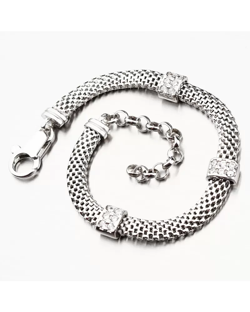 Náramok je zdobený drobnými dielikmi, ktoré sú osadené zirkónmi v briliantovom bruse. Zirkóny sú precízne vsadené do striebra tak, aby ste sa nemusela obávať vypadnutiu kameňa. náramok zapnúť až na dĺžku 20 cm.