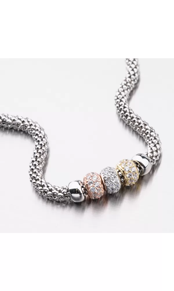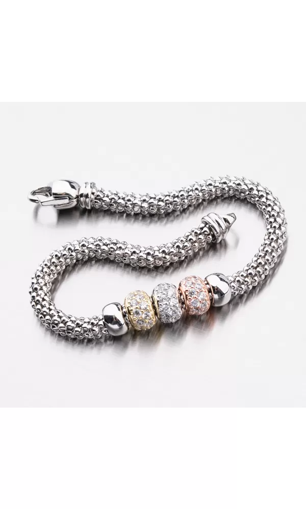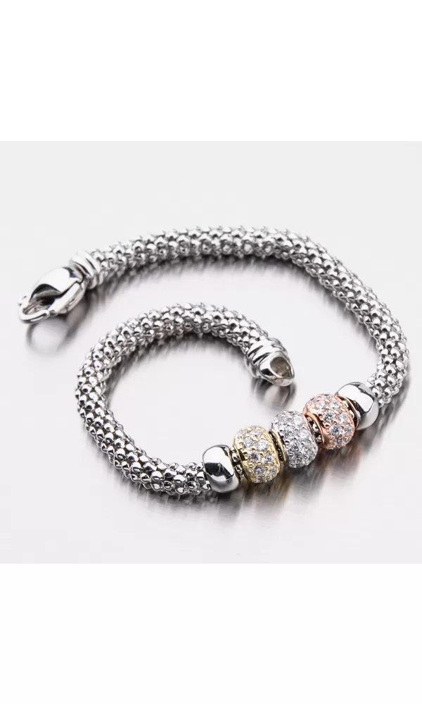 Naozaj neprehliadnuteľný náramok je zdobený valčekmi vo farbách žltého a ružového zlata. Valčeky sú vysadené zirkónmi v briliantovom bruse. Strieborný náramok sa zapína na masívnu karabínu.