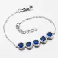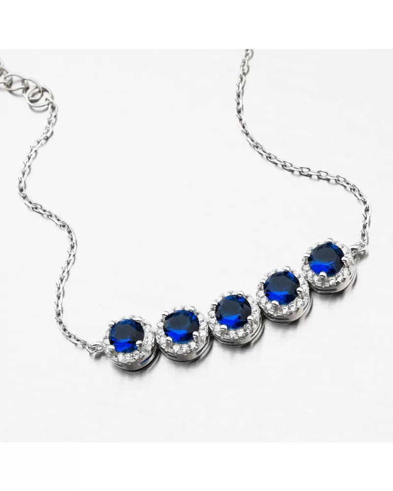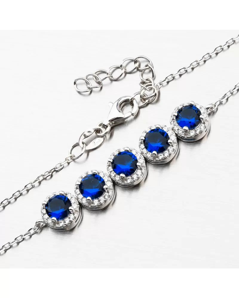 Dámsky strieborný náramok v úplne luxusnom prevedení, ktorý oslní tmavo modrými zirkónmi vo farbe zafíru. Náramok je tvorený retiazkou typu Anker a potom v strede náramku sa nachádza nádherná ozdoba. Je z piatich okrúhlych príveskov, kde je v každom usadený modrý zirkón, ktorý je po celom obvode zvýraznený drobnými bielymi zirkónmi. A takto sú usadené jeden vedľa druhého.