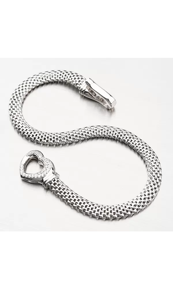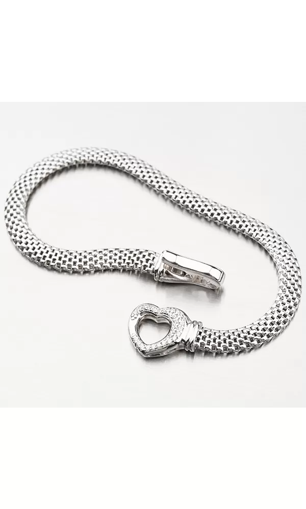 Elegantný dámsky náramok so srdiečkom, ktoré je zdobené žiarivými zirkónmi brúsené do briliantovom bruse. Náramok má pevnú dĺžku - napriek tomu je mierne pružný a jeho dĺžka je 19 až 20 cm.