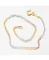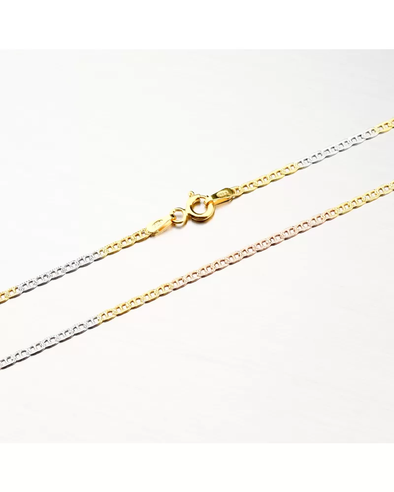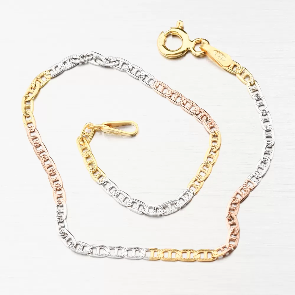 Designový trojfarebný náramok je vyrobený zo strieborna rýdzosti 925/1000 v lesklej povrchovej úprave so zapínaním na perový krúžok. Retiazka je pozlátená žltou, ružovou a bielou farbou zlata. facetám maximálny lesk, vďaka ktorému dokonale odráža svetlo a majú krásnu brilanciu zo všetkých uhlov pohľadu! Náramok krásne vynikne pri akejkoľvek príležitosti!