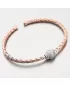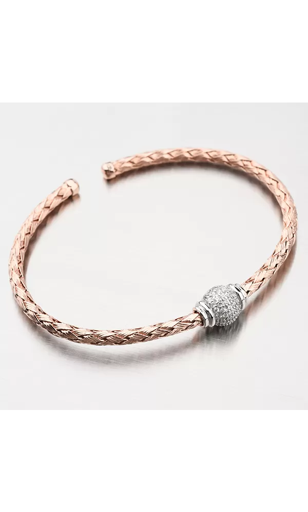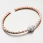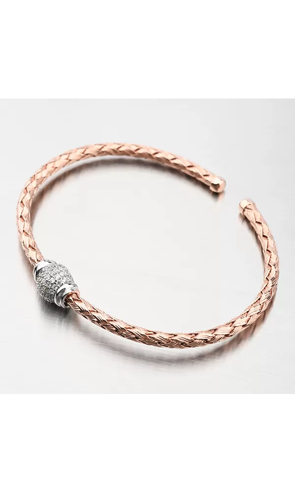 Módny prepletený náramok s variabilným nastavením dĺžky. Náramok je uprostred zdobený žiarivou guličkou osadenou po celom obvode zirkónmi v briliantovom bruse. Ružovú farbu zlata mu dodáva zlatenie PVD Technikou. Prednosťou zlatenia technológií PVD je vysoká tvrdosť a odolnosť proti oteru! Ide o hrubú vrstvu, ktorá preniká do pôvodného materiálu. Zlatenie technológií PVD sa dá porovnať s približne 12 mikrónmi galvanického zlatenia, čo je vysoká hodnota, ktorá pri bežnom nosení vydrží až 12 rokov.