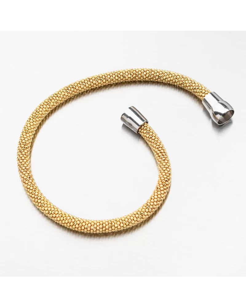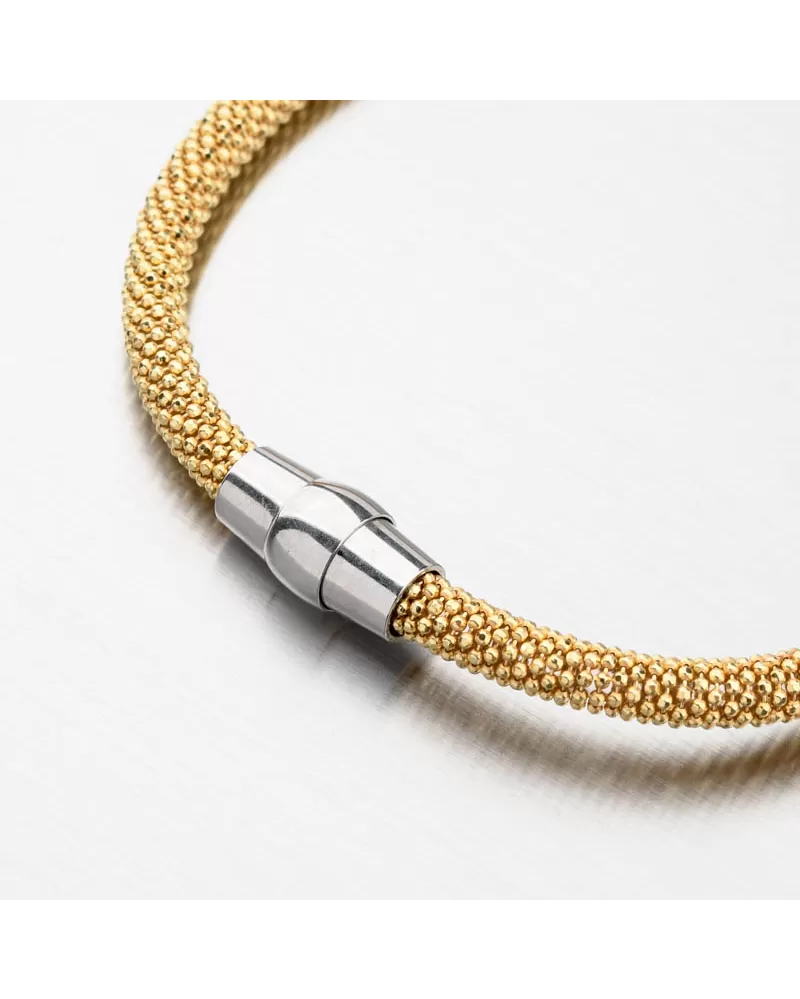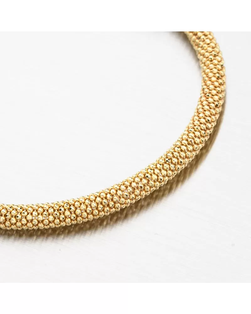 Luxusný náramok tvorený z prepletených drobných guličiek zdobených facetami-gravírovaním vo farbe žltého zlata. Facety sú zhotovené diamantovým nástrojom, ktorý dodáva vzniknutým facetám maximálny lesk, vďaka ktorému dokonale odráža svetlo a majú krásnu brilanciu zo všetkých uhlov pohľadu! Ozdobte svoje zápästie žiarivým šperkom.