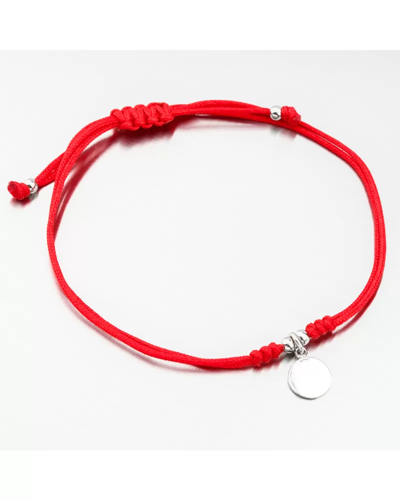 Veľmi obľúbený typ povrázkového náramku, ktorý má výhodu vo svojej univerzálnej veľkosti a tiež vhodnosti pre obe pohlavia. Náramok je tvorený z červeného dvojitého povrázku, ktorý je ozdobený vo svojom strede okrúhlym príveskom a striebornými guličkami. Na prívesok je možné nechať vyryť čokoľvek si budete priať. Vyryť môžete nechať Vami vybraný text ako je napr. meno alebo písmeno. Opis rytiny prosím uveďte v kolónke rytina.