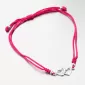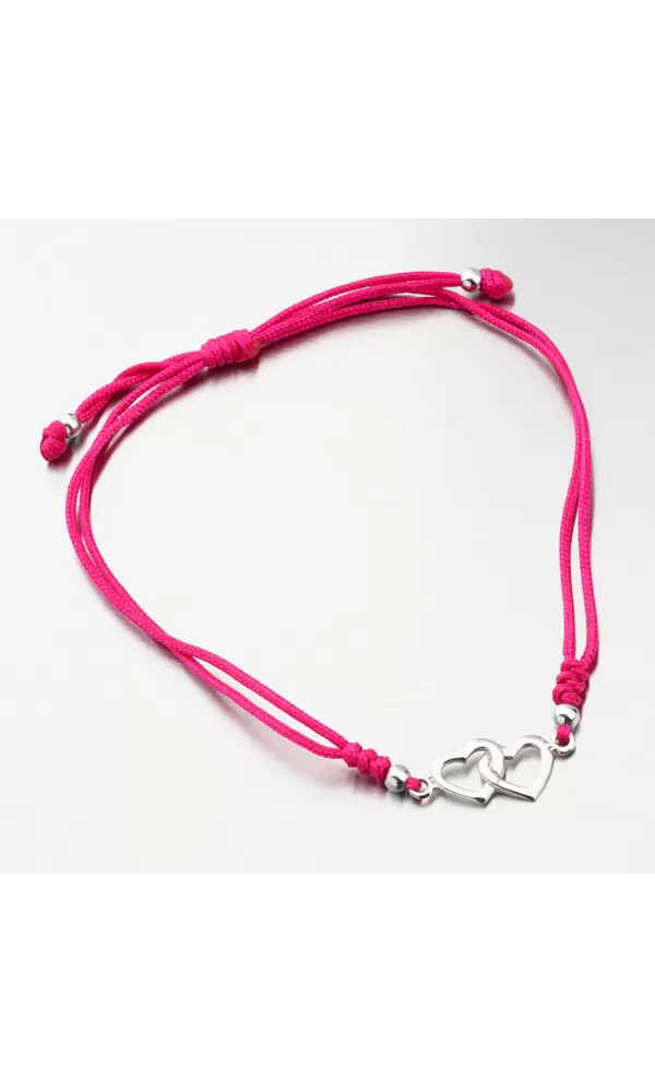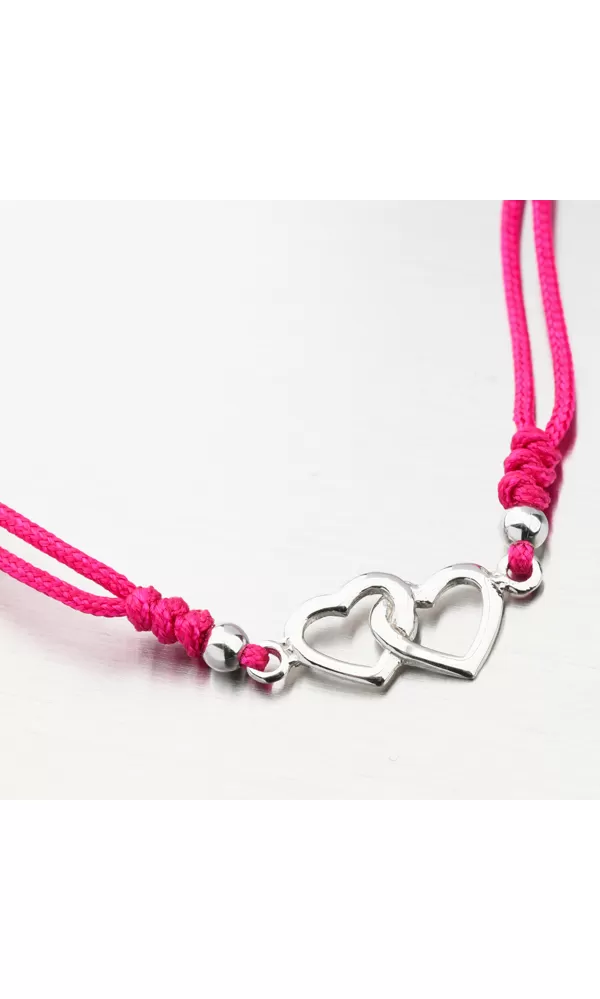 Náramok typu Shamballa nie je len vyzerá vždy skvele a možno ho nosiť k akémukoľvek oblečeniu aj príležitosti. Náramok je tvorený z tmavo ružového dvojitého povrázku z textilu, ktorý je ozdobený vo svojom strede striebornými prepletnými srdiečkami a potom na každej strane jedna strieborná gulička. Guličky sú tiež na koncoch povrázkov.
