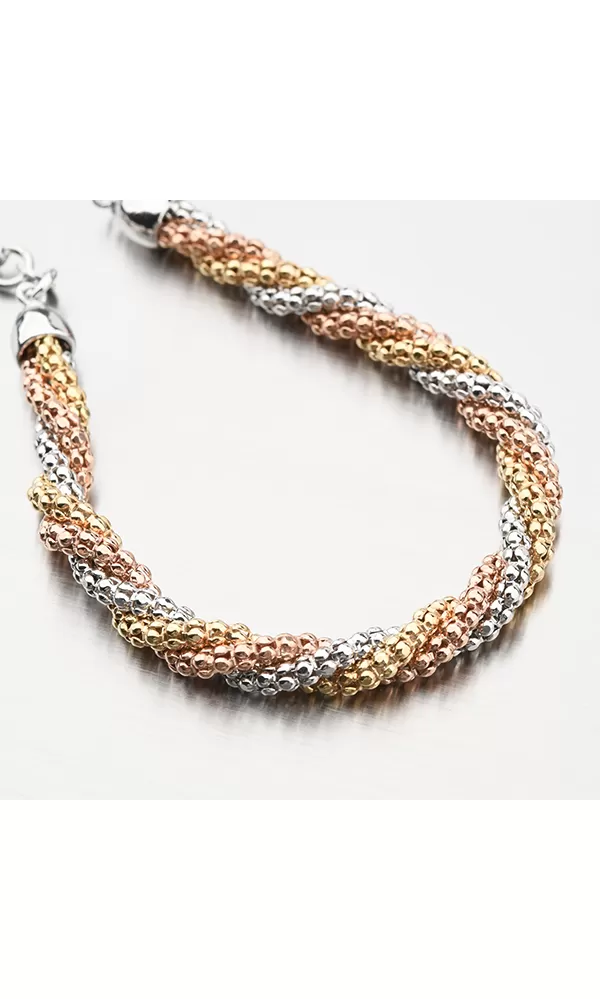 Elegantný náramok zaujme na prvý pohľad dokonalým dizajnom, kde sú jednotlivé časti prepletené. Farba žltého a ružového zlata náramku je daná technikou PVD zlátenia. Výhodou pozlátenia technológiou PVD je vysoká tvrdosť a odolnosť proti oderu! Je to hrubá vrstva, ktorá preniká pôvodným materiálom. PVD pozlátenie možno prirovnať k približne 12 mikrónov galvanického pozlátenia, čo je vysoká hodnota, ktorá pri bežnom nosení vydrží až 12 rokov.