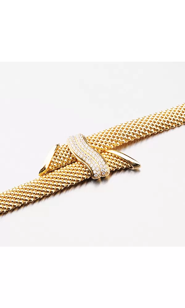 Extragantné šperky pre odvážne ženy dokonale ozdobia vaše zápästie. Náramok je masívny a zdobený zirkónmi v briliantovom bruse. Žltá farba zlata je… Celý popis
